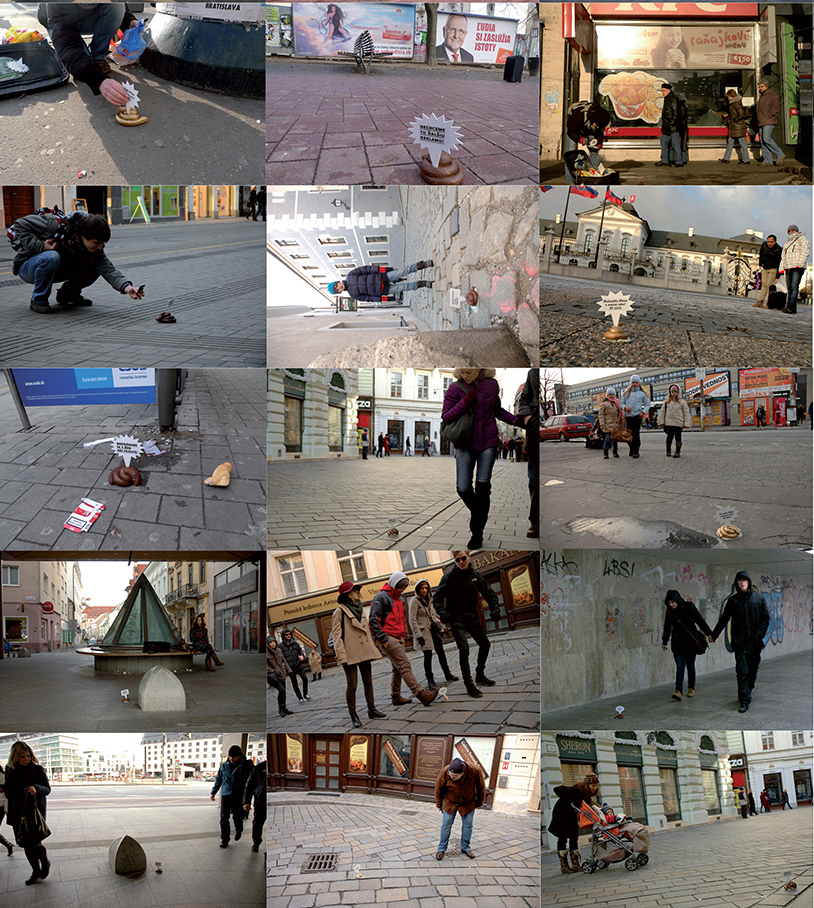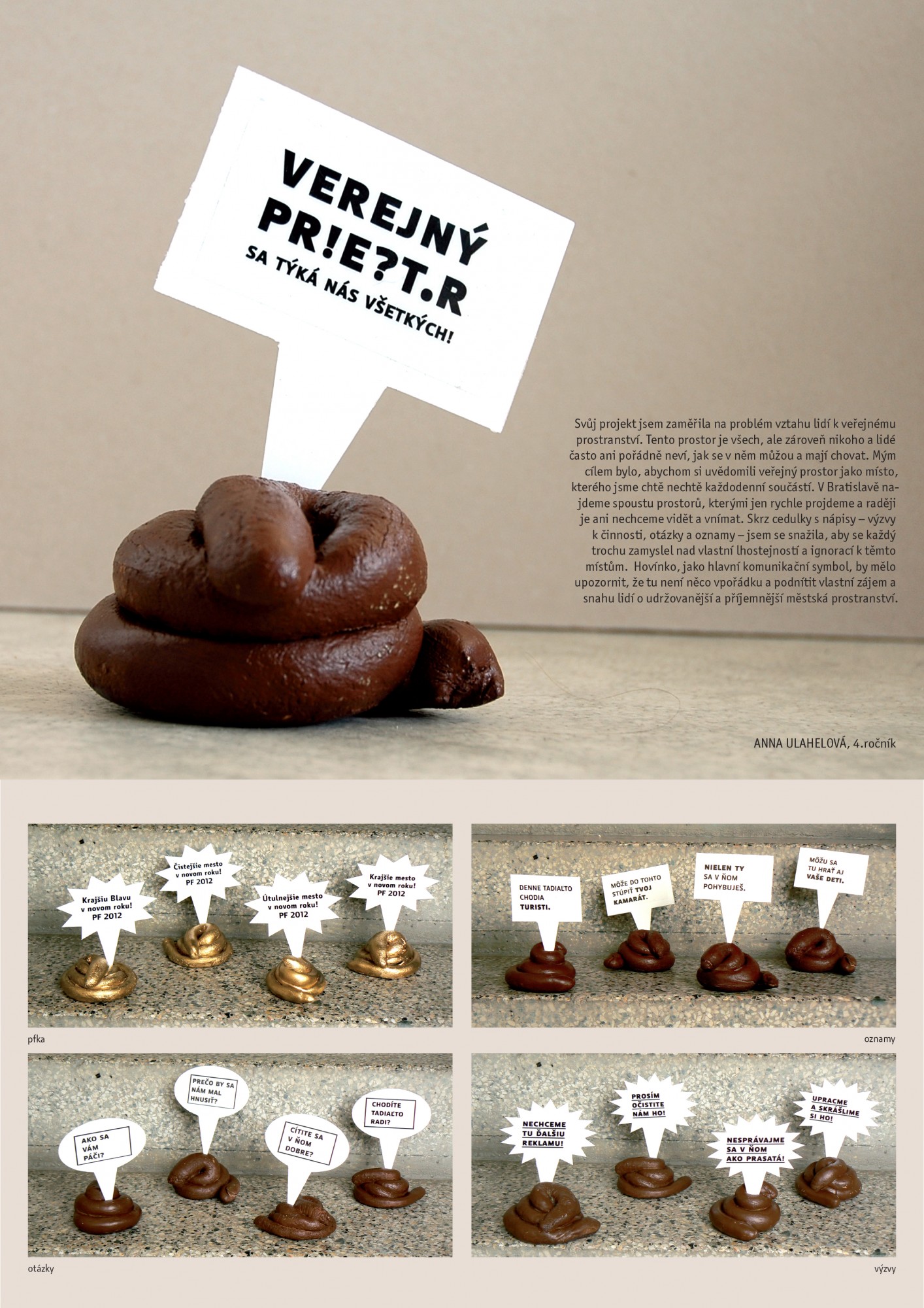 I created a campaign specifically focused on those who are moving in public places. I placed all sorts of signs with messages on the selected areas in Bratislava that are most problematic. I have conceived four different levels of communication - calls for action, questions, announcements and PF wishes. The headlines had reflect a variety of problems - from affordable queries, questions if people feel good, to appeals not act like pigs. As a main medium of communication I created a object that looks like a dog poo. It should attract the attention, make people stop and think about their behaviour in public space.