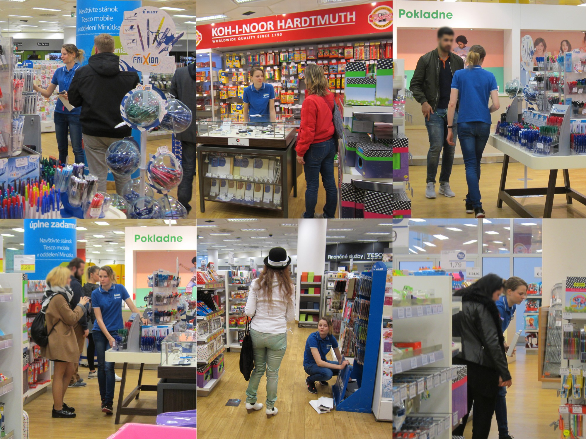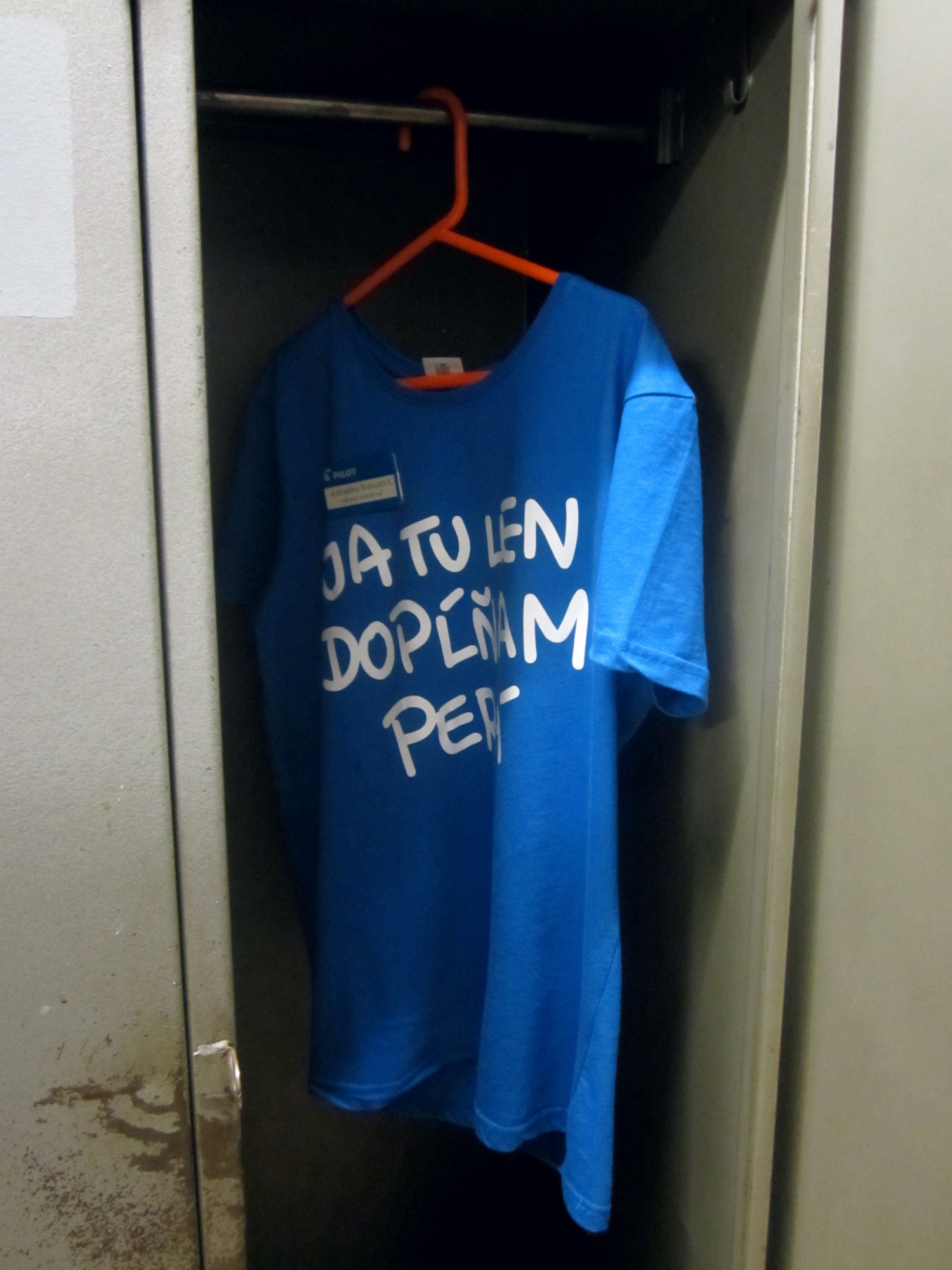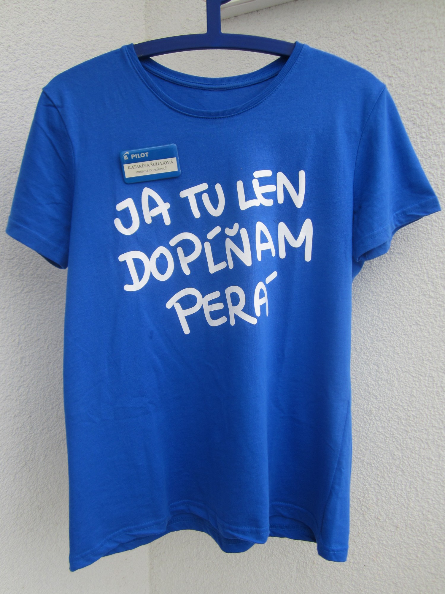 Therefore, I decided to work with my outfit. I designed myself a new working T-shirt with a sign on both sides. To choose the right words was the most problematic part for me, because it had to be short and as clear as possible, but I didn't want to offend anyone at the same time. I wrote "I am just filling in pens here" at the front and "I'd be happy to help with Pilot pens" at the back of the T-shirt. I am also aware that there will still be cases when I can't avoid a questions, but my goal is at least to minimize it.