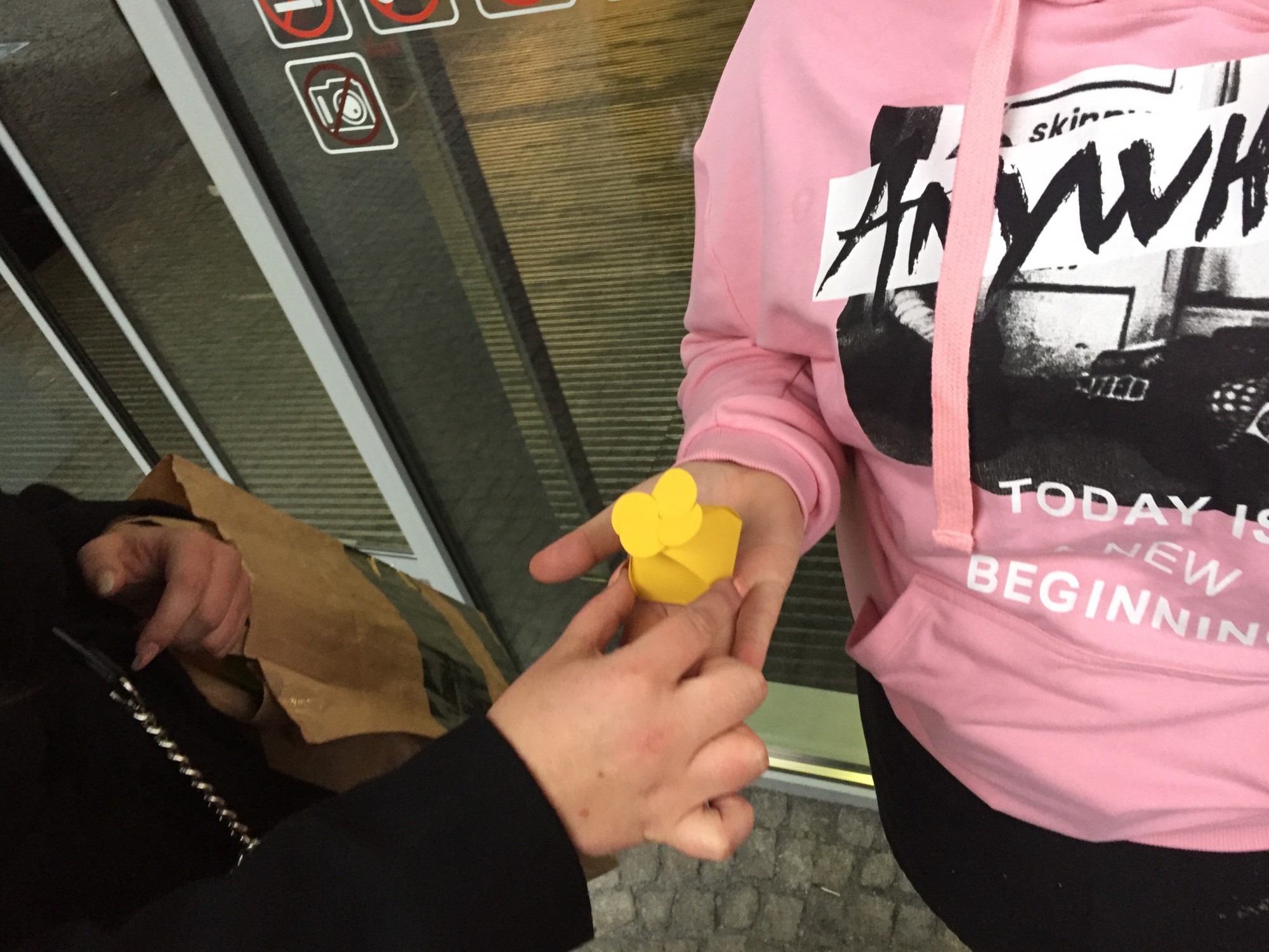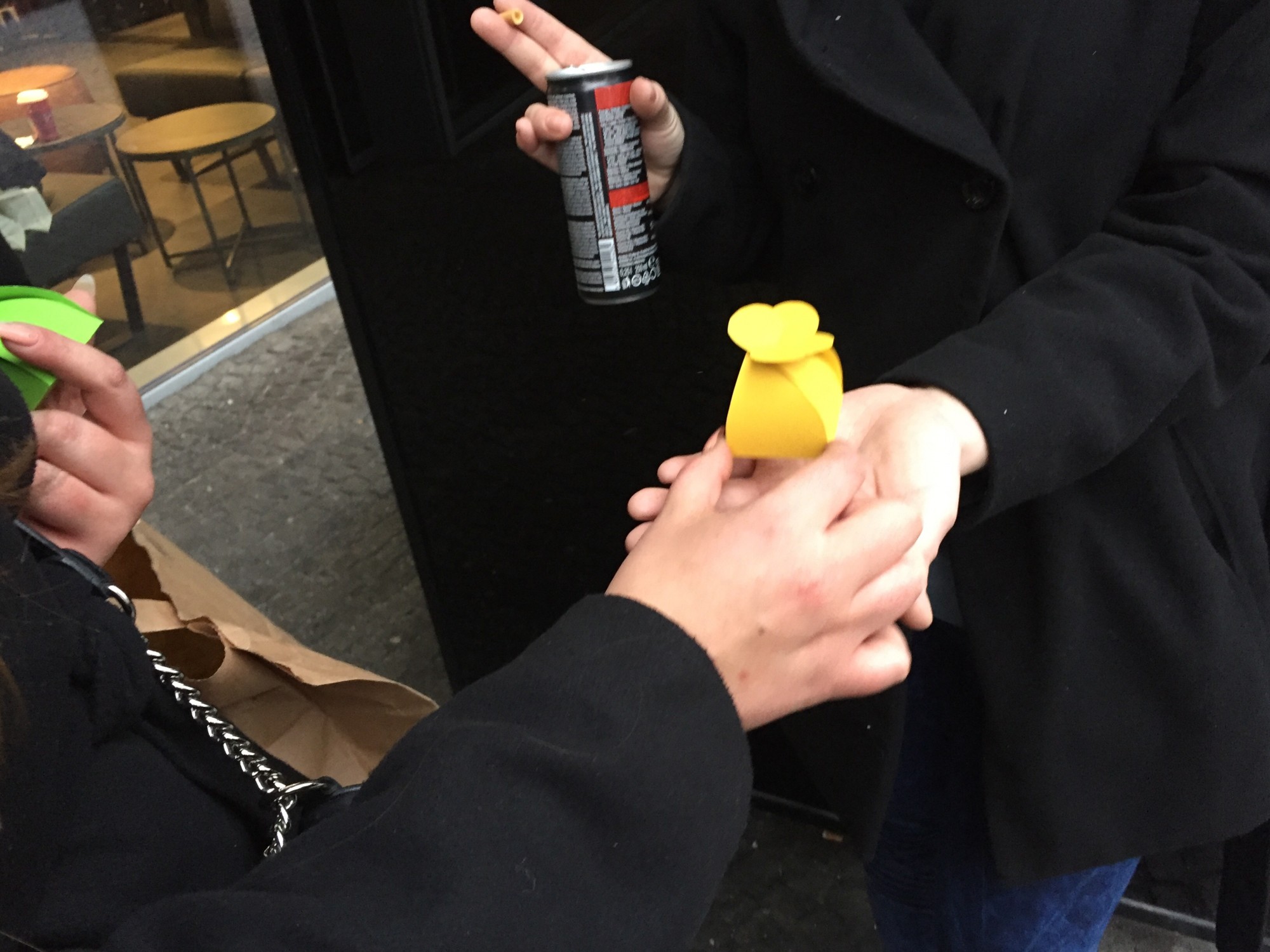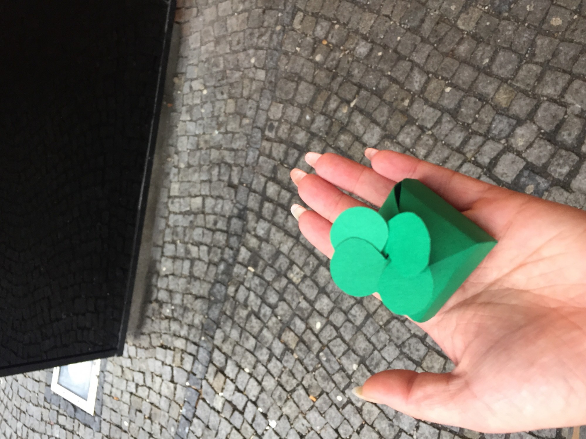 My project should bring to people happiness and joy.  After I met them on the streets of Bratislava exactly this happened as I expected and hoped for. I wanted to give little joy to people by giving them a little box that contains a happy message inside. The close-down of the box was in a form of four-leaf-clover, what is the symbol of fortune and happiness. Many people didn’t look at me, most of them didn’t understand why am I giving free stuff, they were wondering.