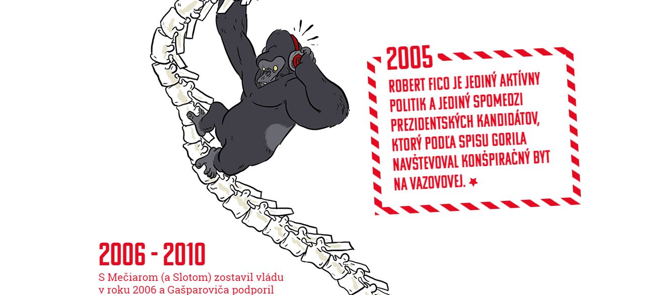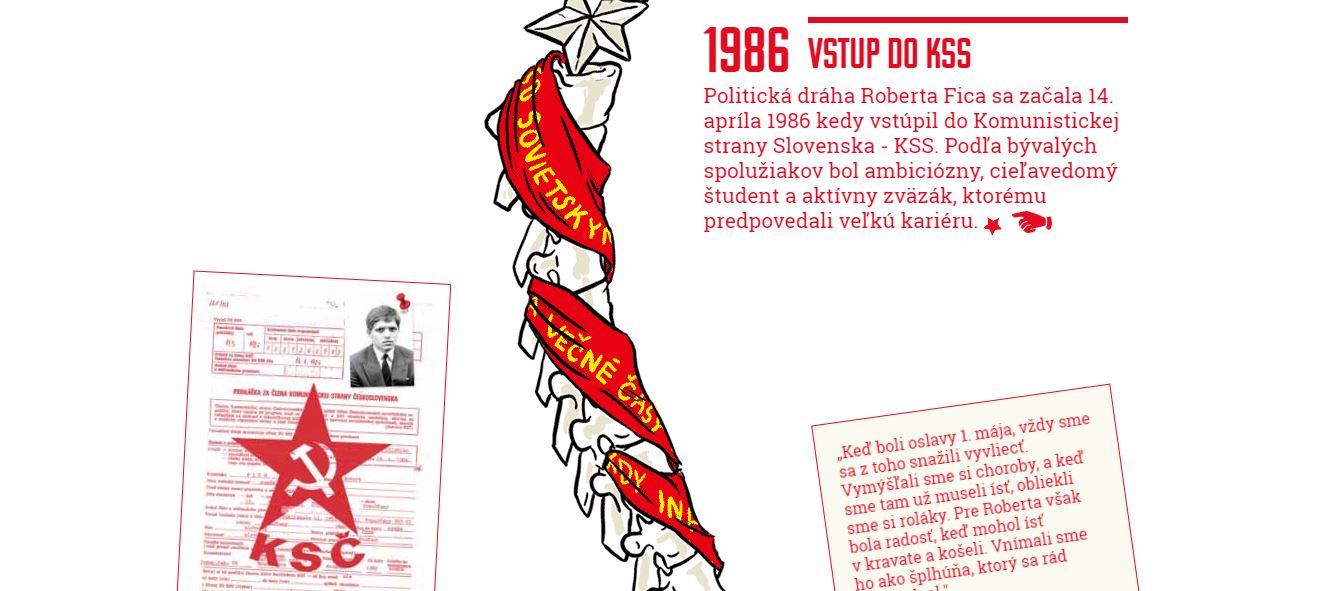A remarkable spine of Robert Fico is a reaction to Robert Fico's presidential candidacy announcement in 2014. Blogger Jakub Goda in collaboration with graphic designer Tereza Šufliarska and illustrator Matúš Vizár created an interesting website that summarises the 27-year-old political career of Slovak prime minister Robert Fico.
