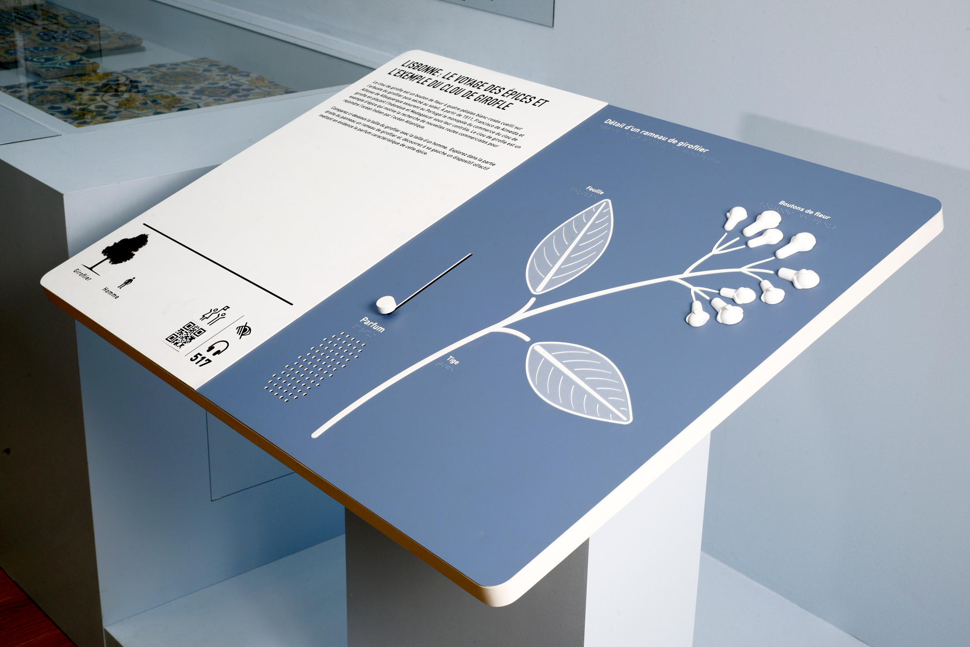 author: Tactile StudioTactile and olfactory station that describes the historical journey of spices and, as an example, presents the clove branch and its scent, part of the multi-sensory trail in the permanent exhibition of MuCEM, Marseille