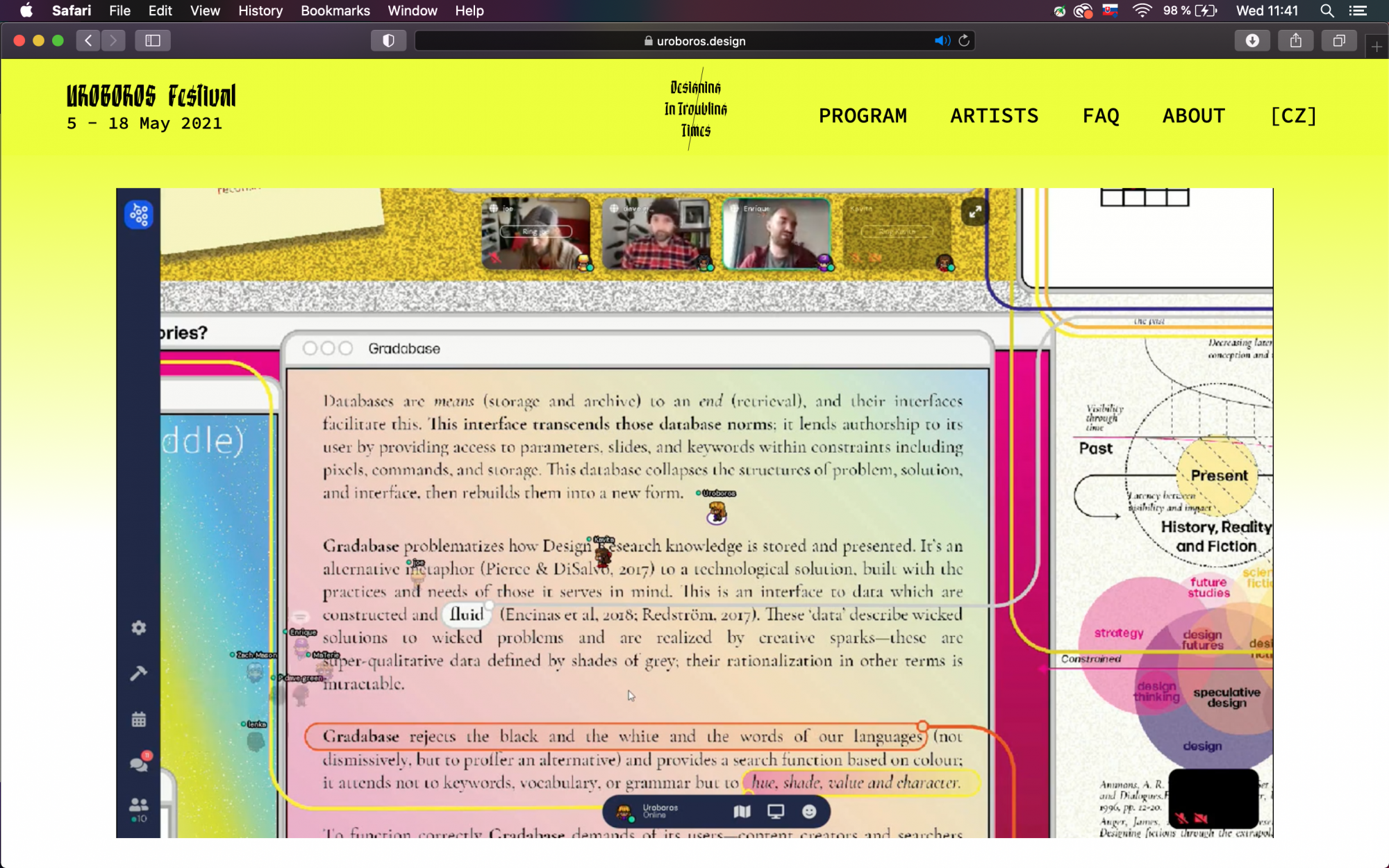 One morning, during Uroboros Festival 2021, we met in a non-conventional online space standing on a rejected paper from the ACM IDS Conference along with its authors, and initiated a digital stroll in which to collectively murmur. Design researchers Joseph Lindley, David Green, and Zach Manson built this space in gather.town and brought us together to share our perspectives on fluidity, data, time, and metanarratives. The design was based on the manuscript ‘Ways of Seeing Design Research’ — a reflection on state-of-the-art design research as a discipline.