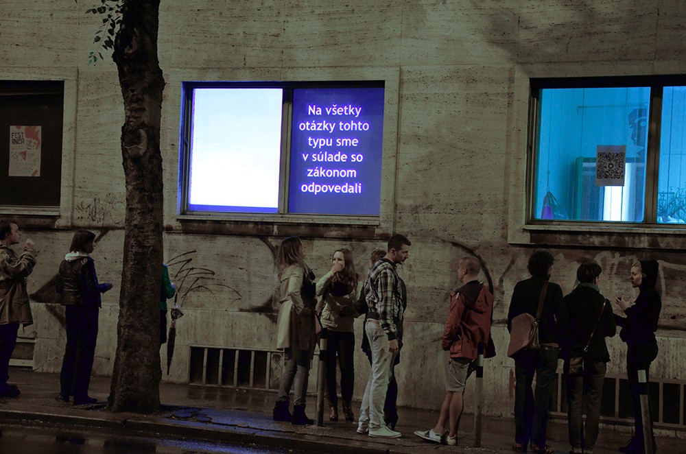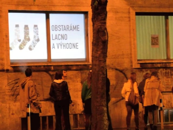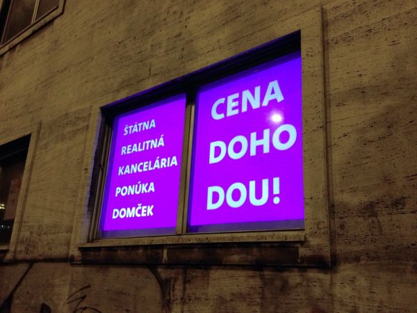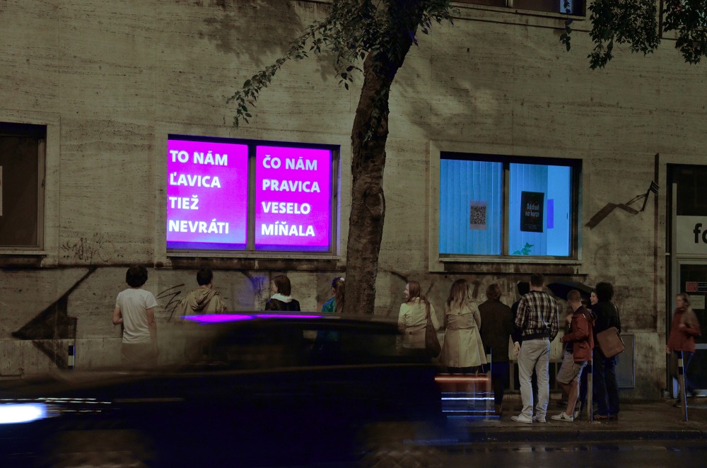Critical window is original format of short critical visual reflections made by graphic designers and projected onto the street from three windows of the culture and co-work space called Foajé on Štefánikova street in Bratislava. They used to reflect the current critical political or social issues that resonate in Slovakia. Sometimes they are related with the public events organised inside the Foaje showing the personal critical attitude of their authors towards certain topics of these events.