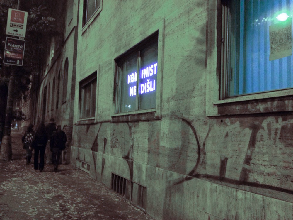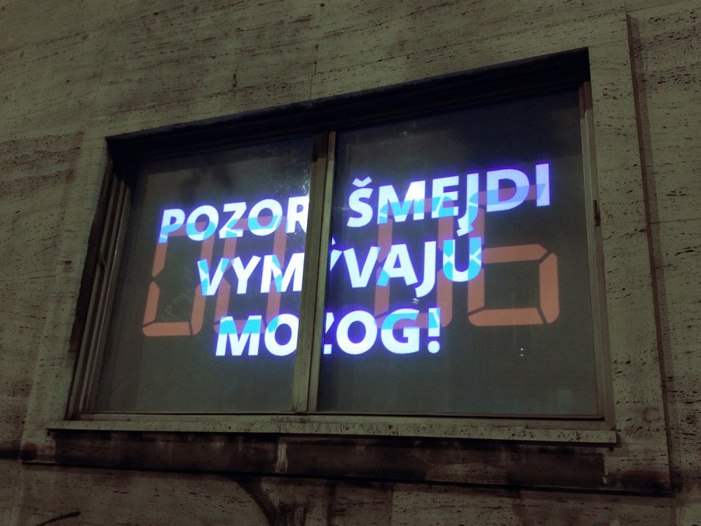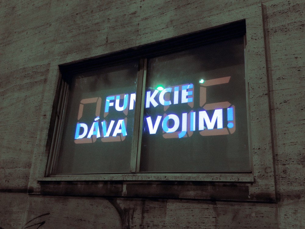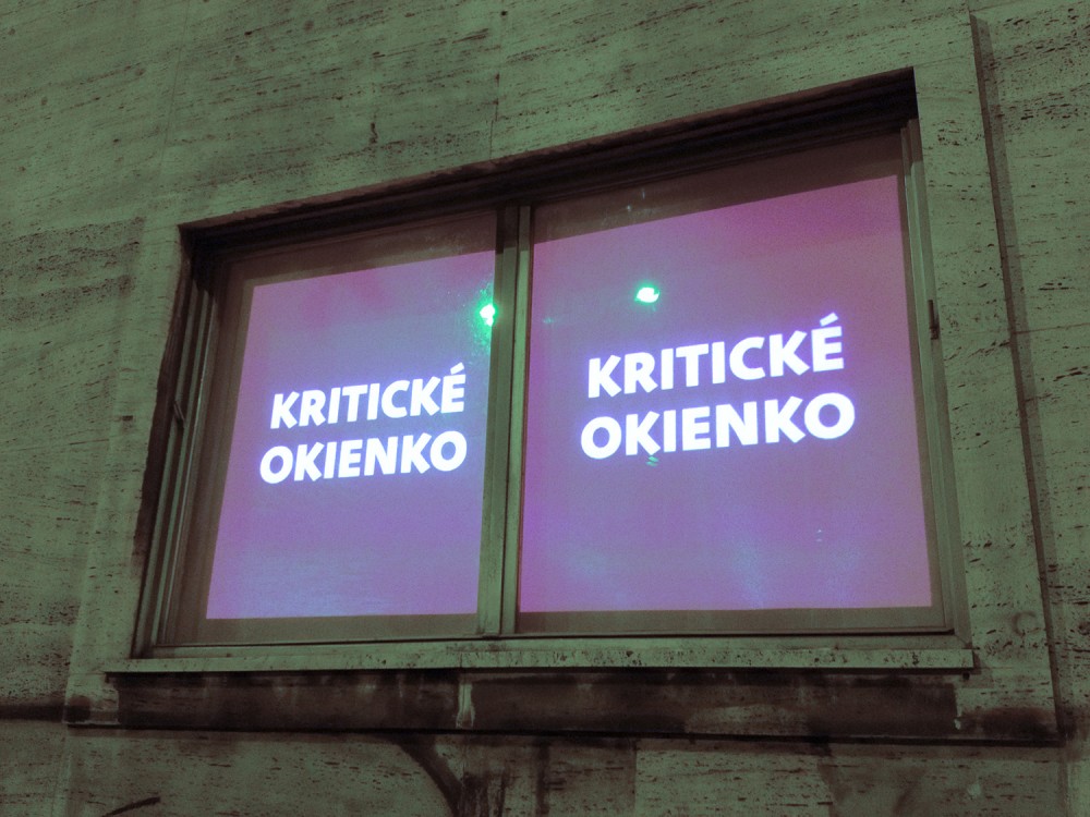 Critical window is original format of short critical visual reflections made by graphic designers and projected onto the street from three windows of the culture and co-work space called Foajé on Štefánikova street in Bratislava. They used to reflect the current critical political or social issues that resonate in Slovakia. Sometimes they are related with the public events organised inside the Foaje showing the personal critical attitude of their authors towards certain topics of these events.