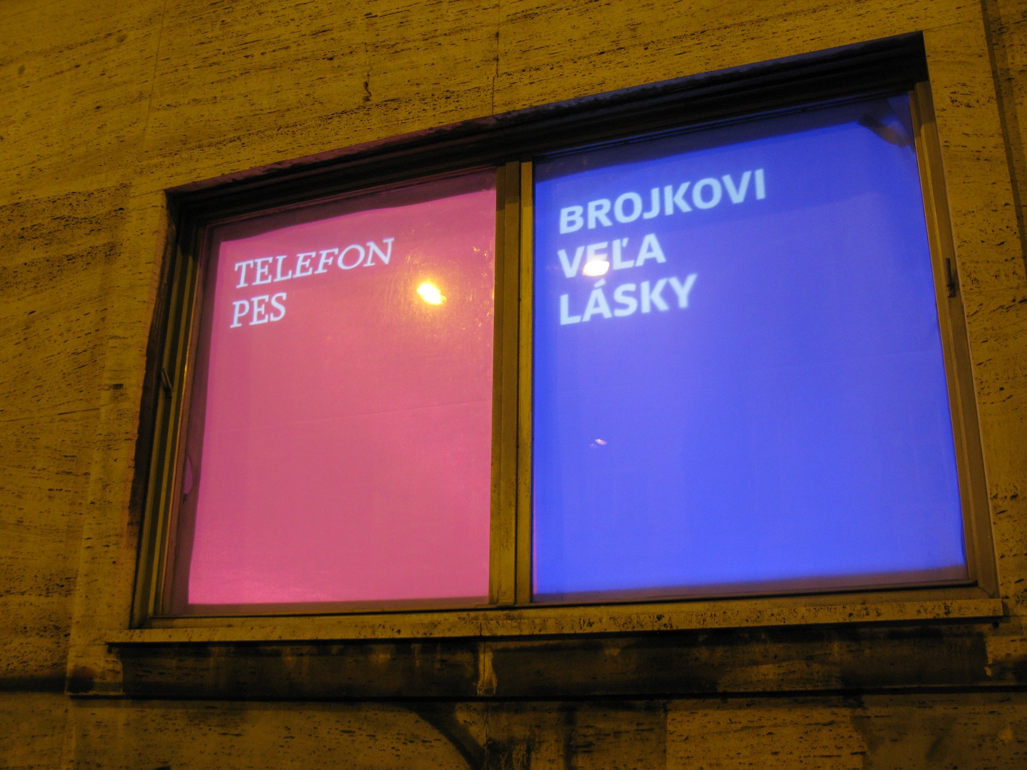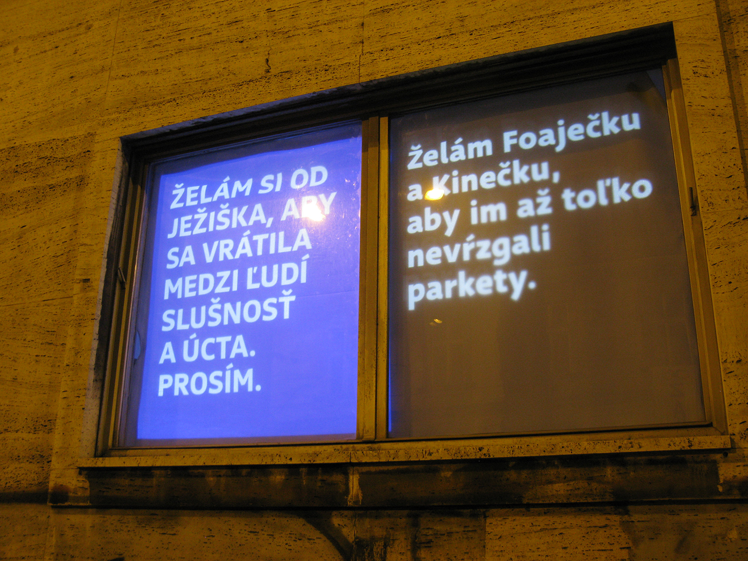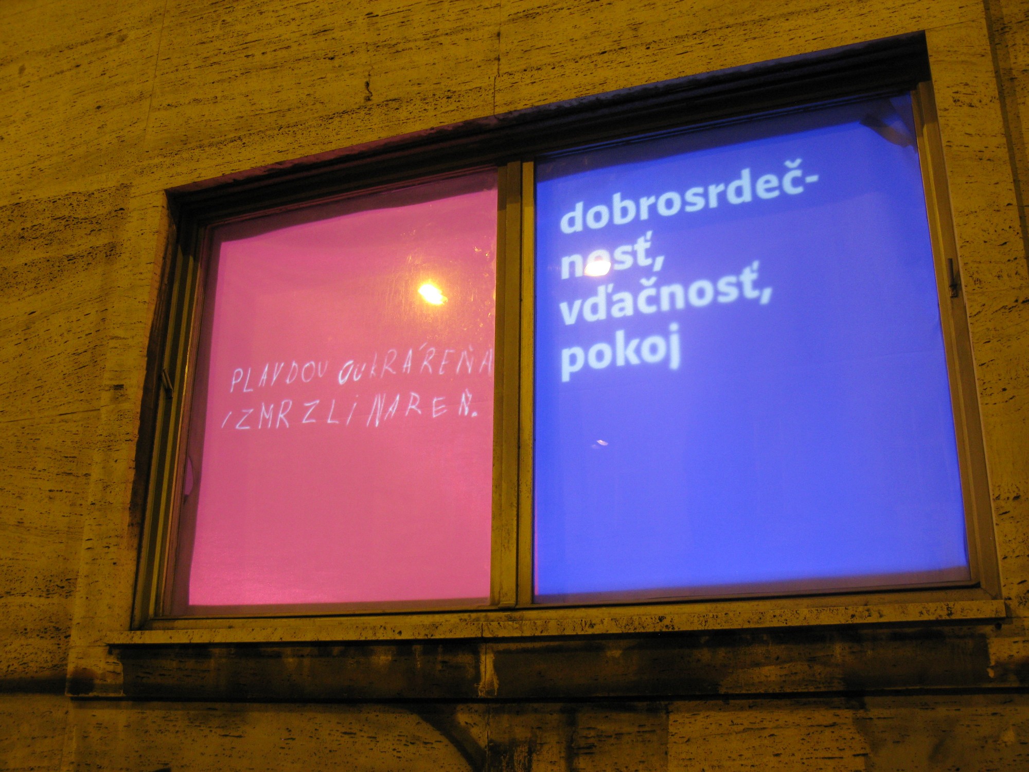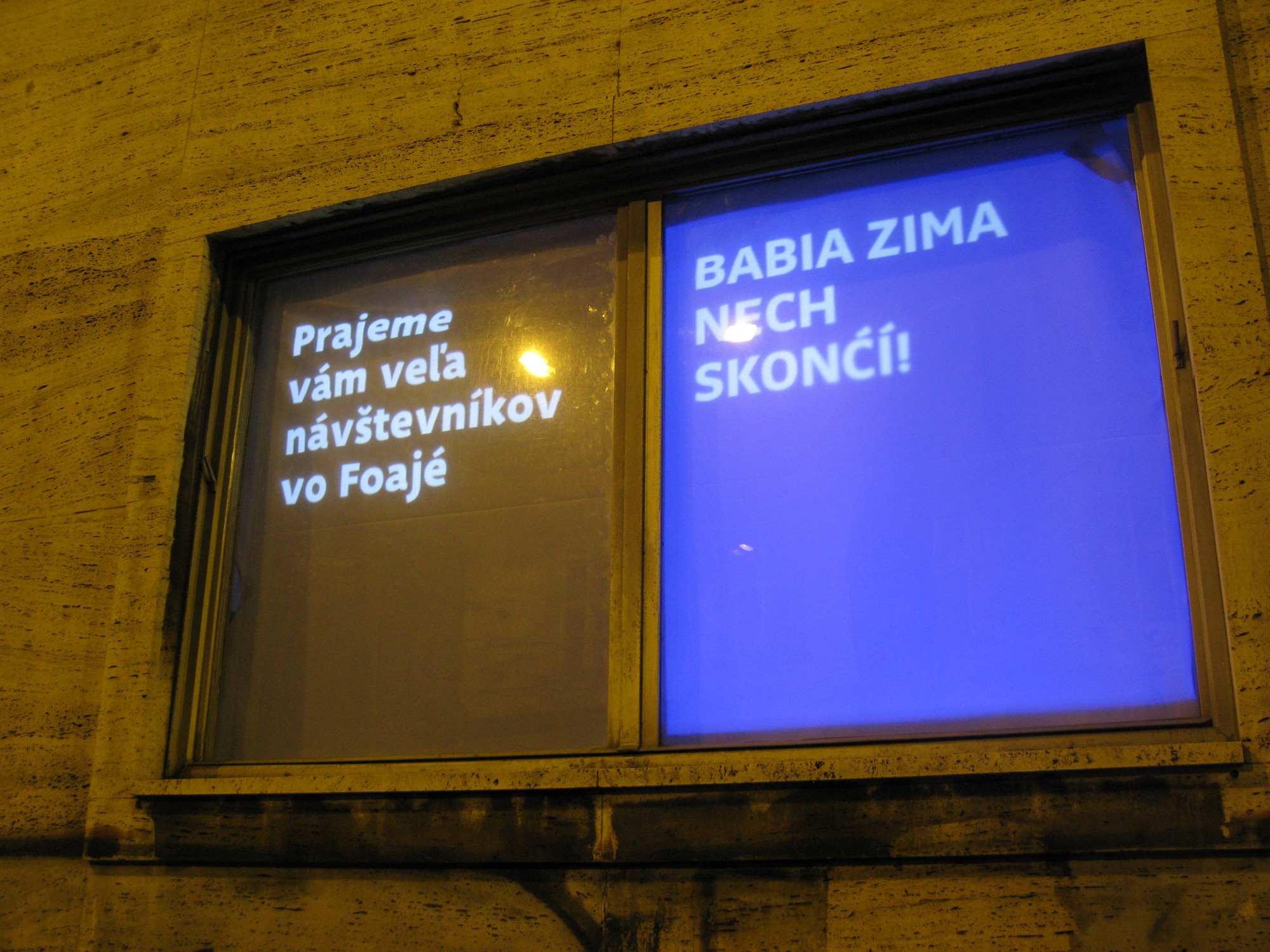 Critical window is original format of short critical visual reflections made by graphic designers and projected onto the street from three windows of the culture and co-work space called Foajé on Štefánikova street in Bratislava. They used to reflect the current critical political or social issues that resonate in Slovakia. Sometimes they are related with the public events organised inside the Foaje showing the personal critical attitude of their authors towards certain topics of these events. Authors: Katarína Balážiková, Hana Hudáková