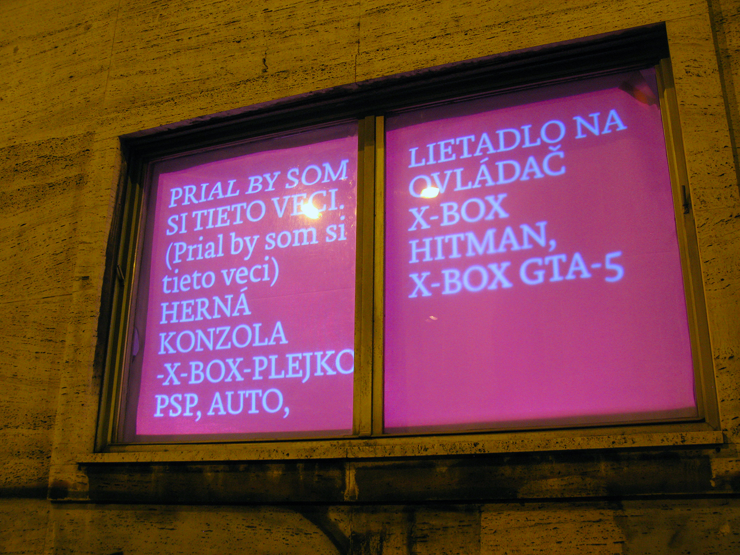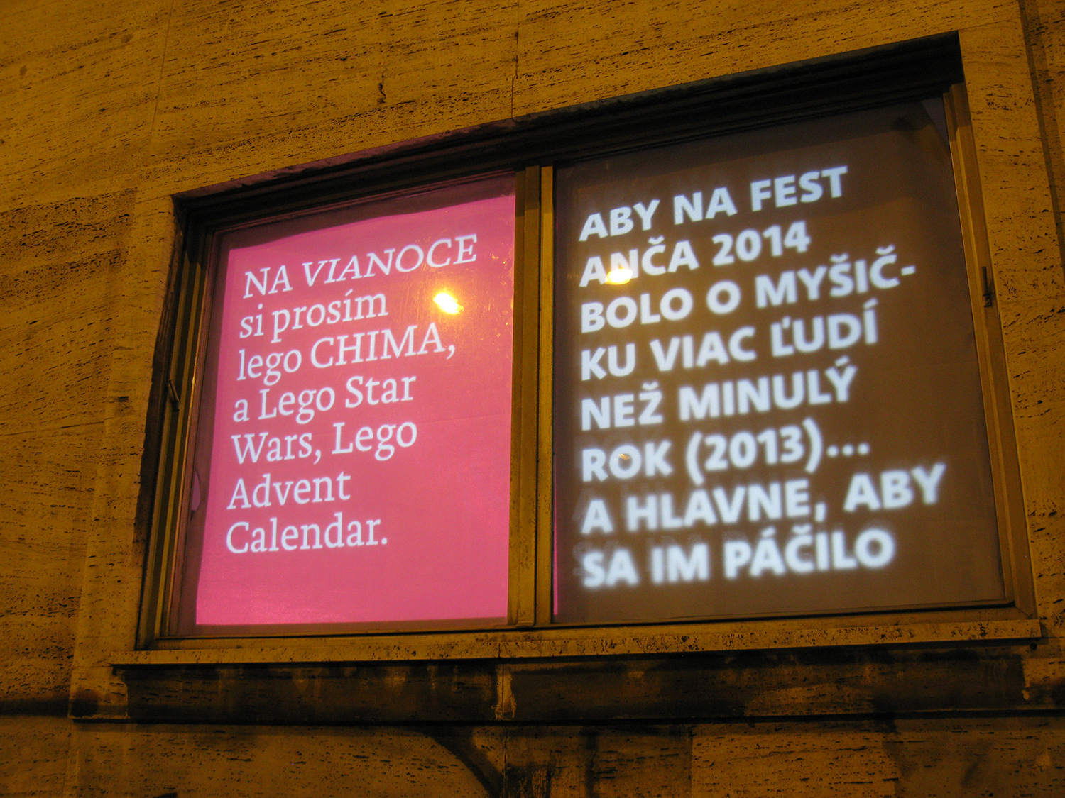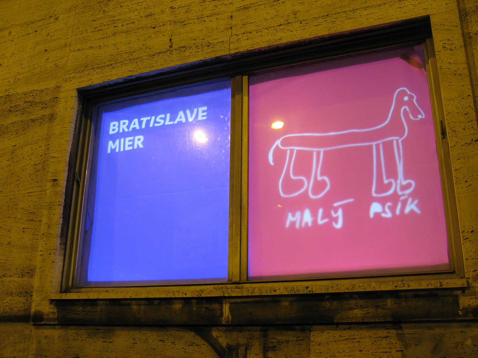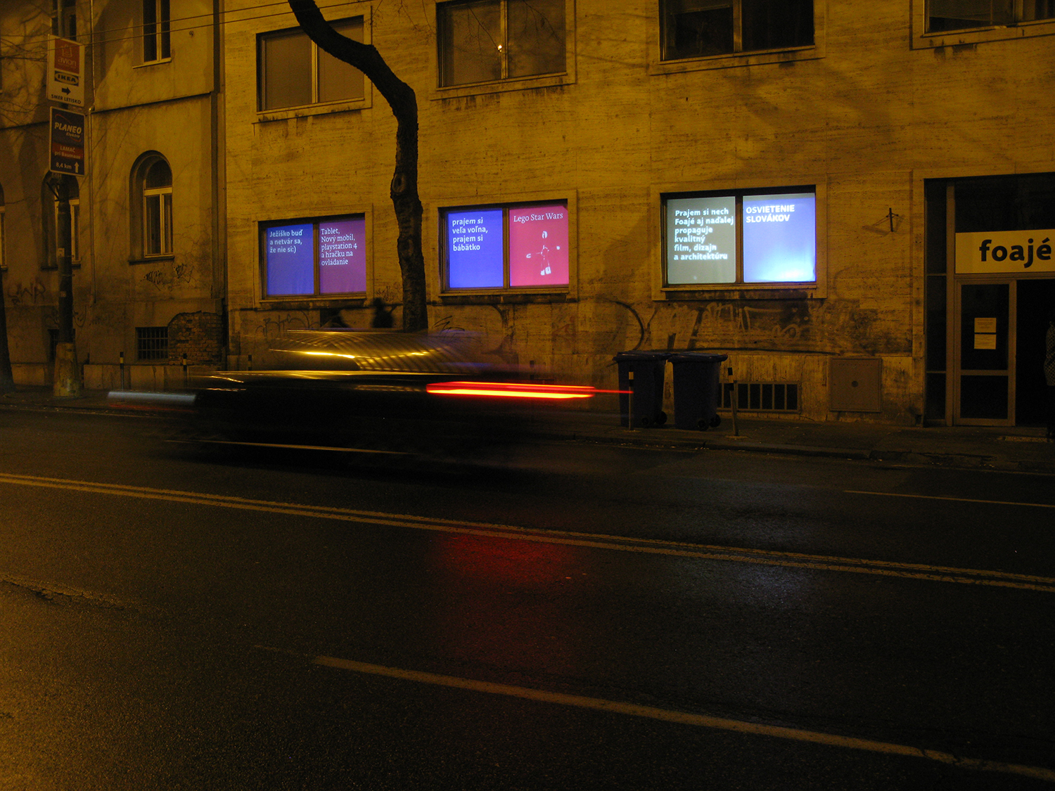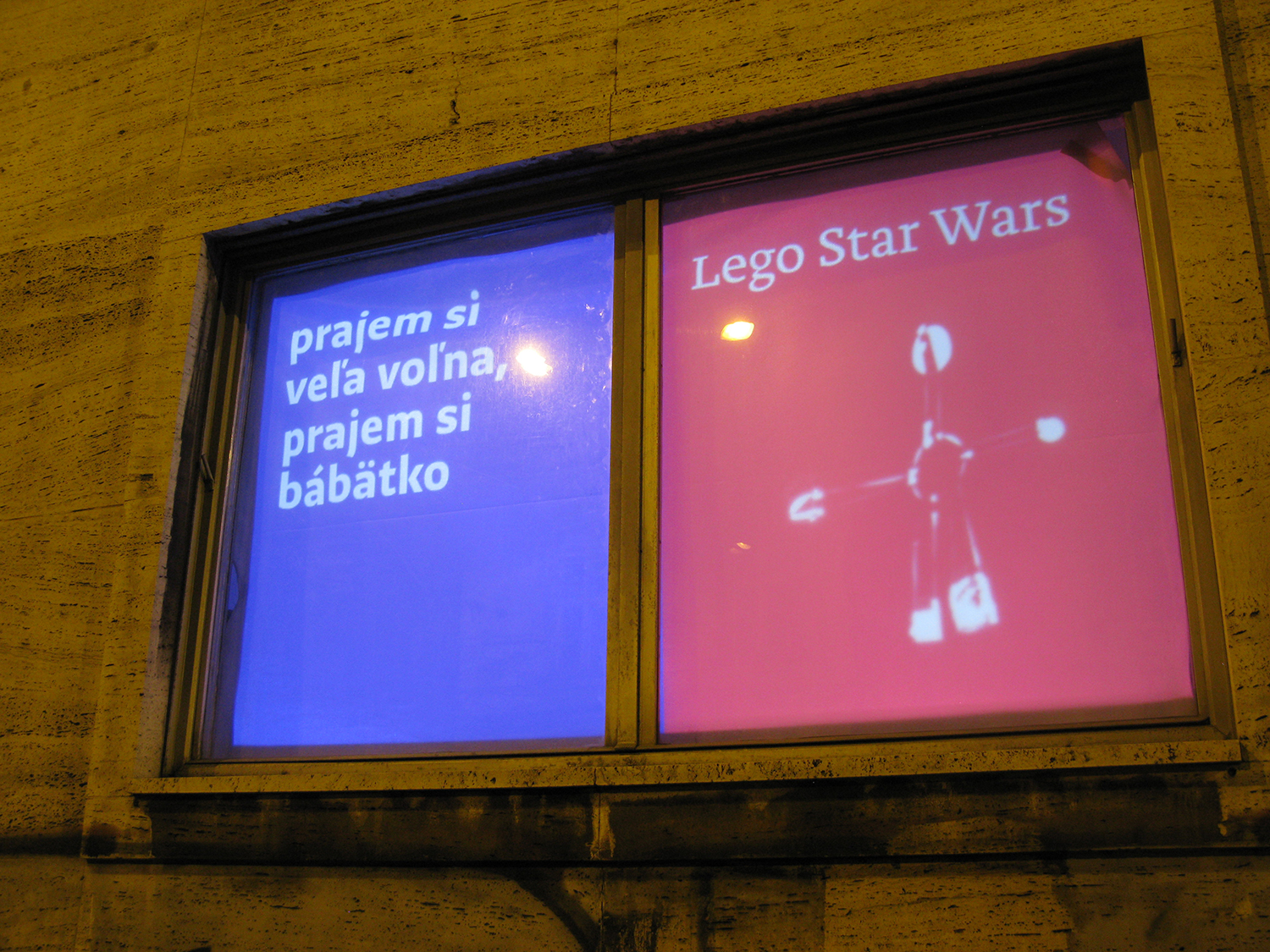 Critical window is original format of short critical visual reflections made by graphic designers and projected onto the street from three windows of the culture and co-work space called Foajé on Štefánikova street in Bratislava. They used to reflect the current critical political or social issues that resonate in Slovakia. Sometimes they are related with the public events organised inside the Foaje showing the personal critical attitude of their authors towards certain topics of these events. Authors: Katarína Balážiková, Hana Hudáková