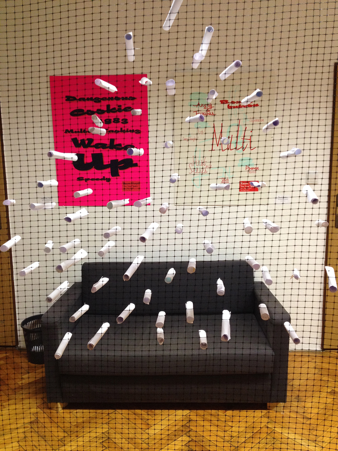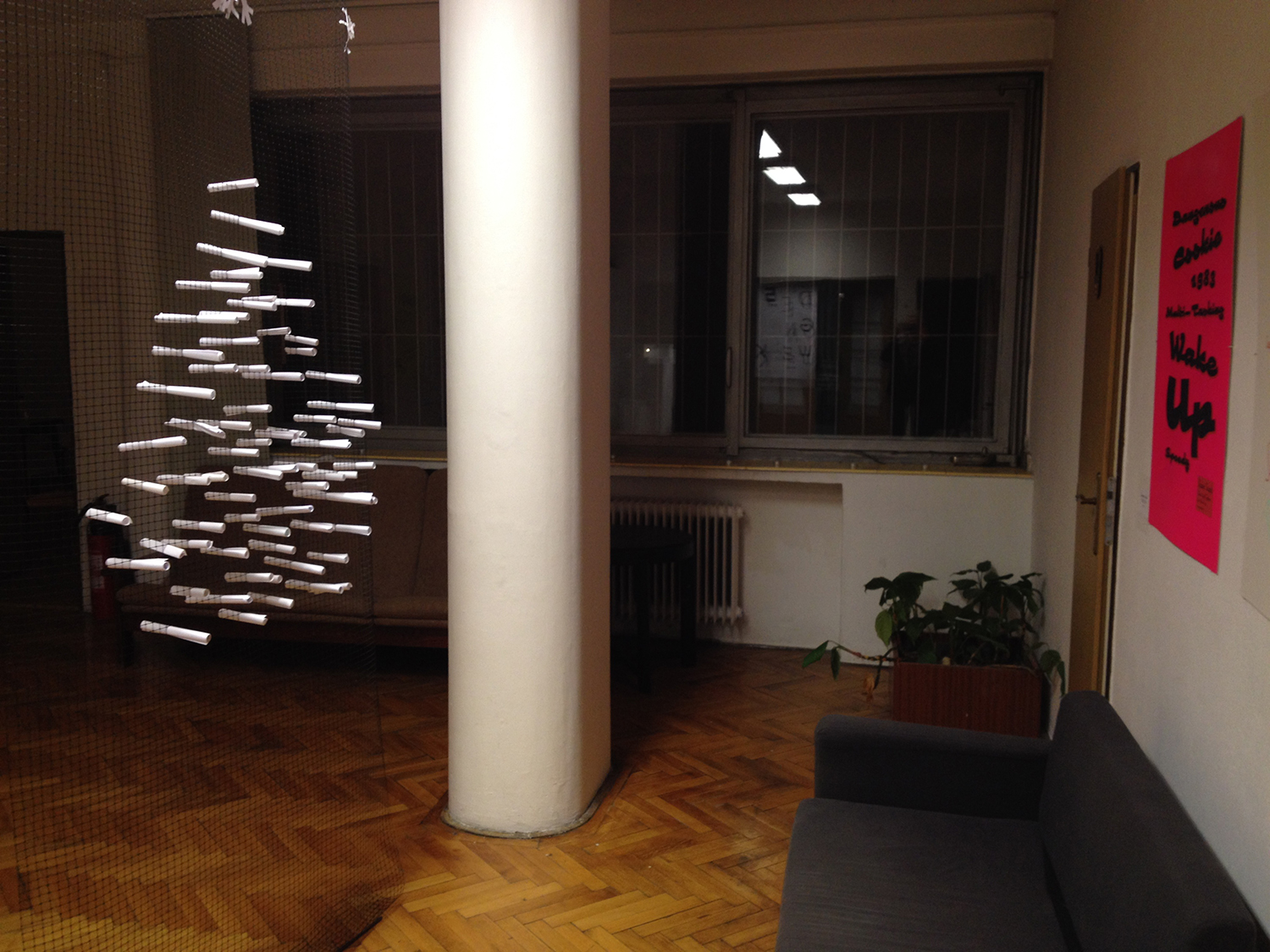 Participants were supposed to write their wish on a peace of paper, roll it and add to a plastic grid installed inside the Foajé space. On the day of the screening, wishes were unfolded, read and digitalised and transformed into animation. Wishes on blue background were written by adults, on pink background by kids and on black background by members od Foajé. This animated wishes were published on the windows of Foajé for the public on December 19th short before Christmas.