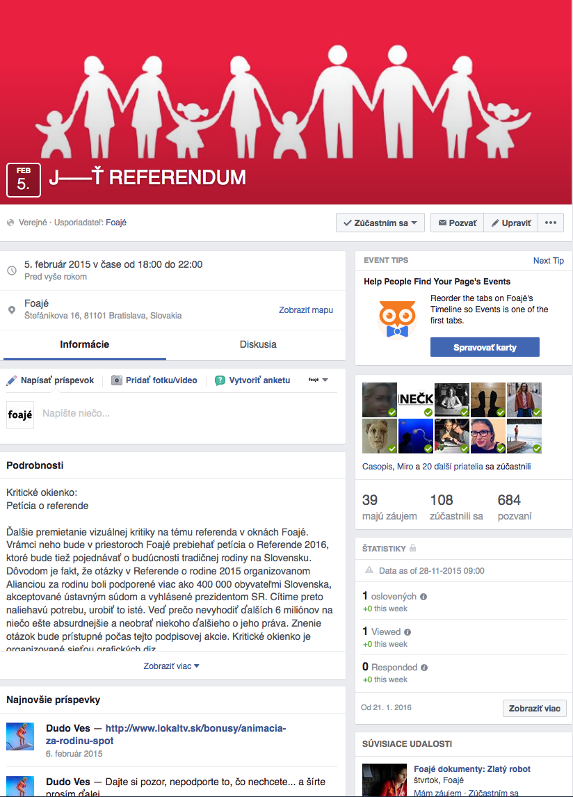 An event from the series Critical Window organized by Open Design Network and Open Design Studio. Within this critical project and visual performance on the windows of the cultural and co-work space called Foaje, designers organized an ironic petition for a fictive future referenum 2016, which would discuss the future of the “traditional” family in Slovakia. It was a reacton on the referendum on the family in 2015 organized by the Alliance for the family that was supported by more than 400,000 inhabitants of Slovakia. It was accepted by the Constitutional Court and promulgated by the President of the Slovak Republic.