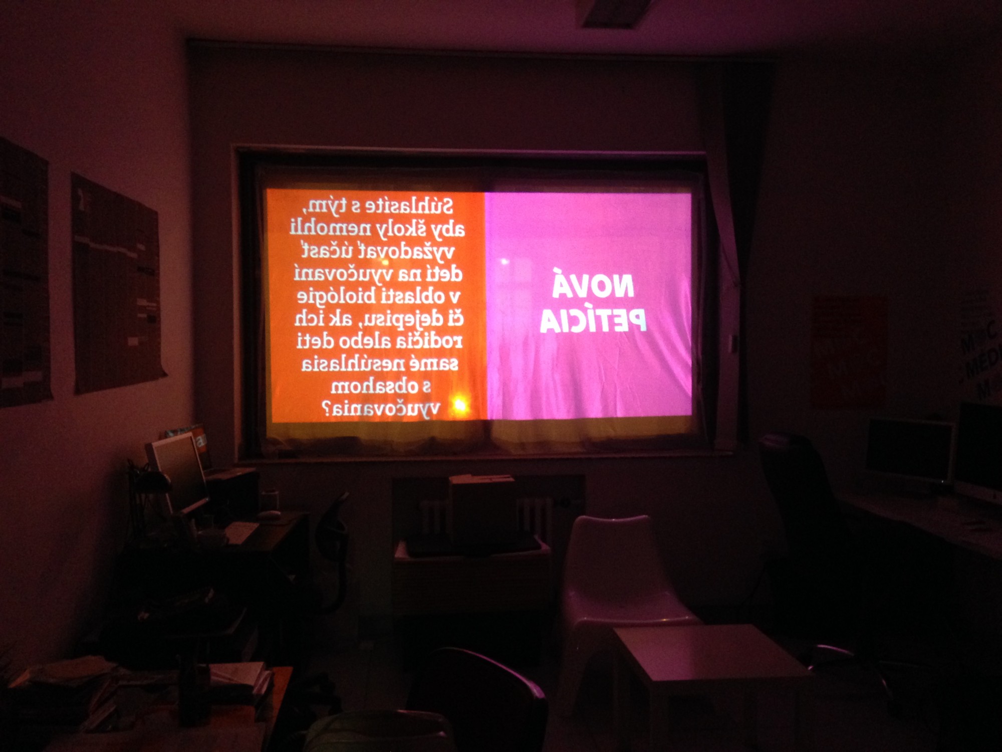 Critical window is original format of short critical visual reflections made by graphic designers and projected onto the street from three windows of the culture and co-work space called Foajé on Štefánikova street in Bratislava. They used to reflect the current critical political or social issues that resonate in Slovakia. Sometimes they are related with the public events organized inside the Foaje showing the personal critical attitude of their authors towards certain topics of these events.