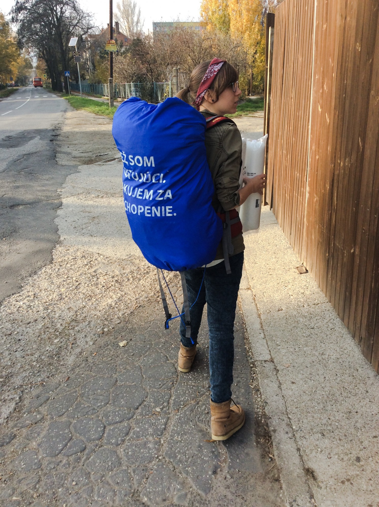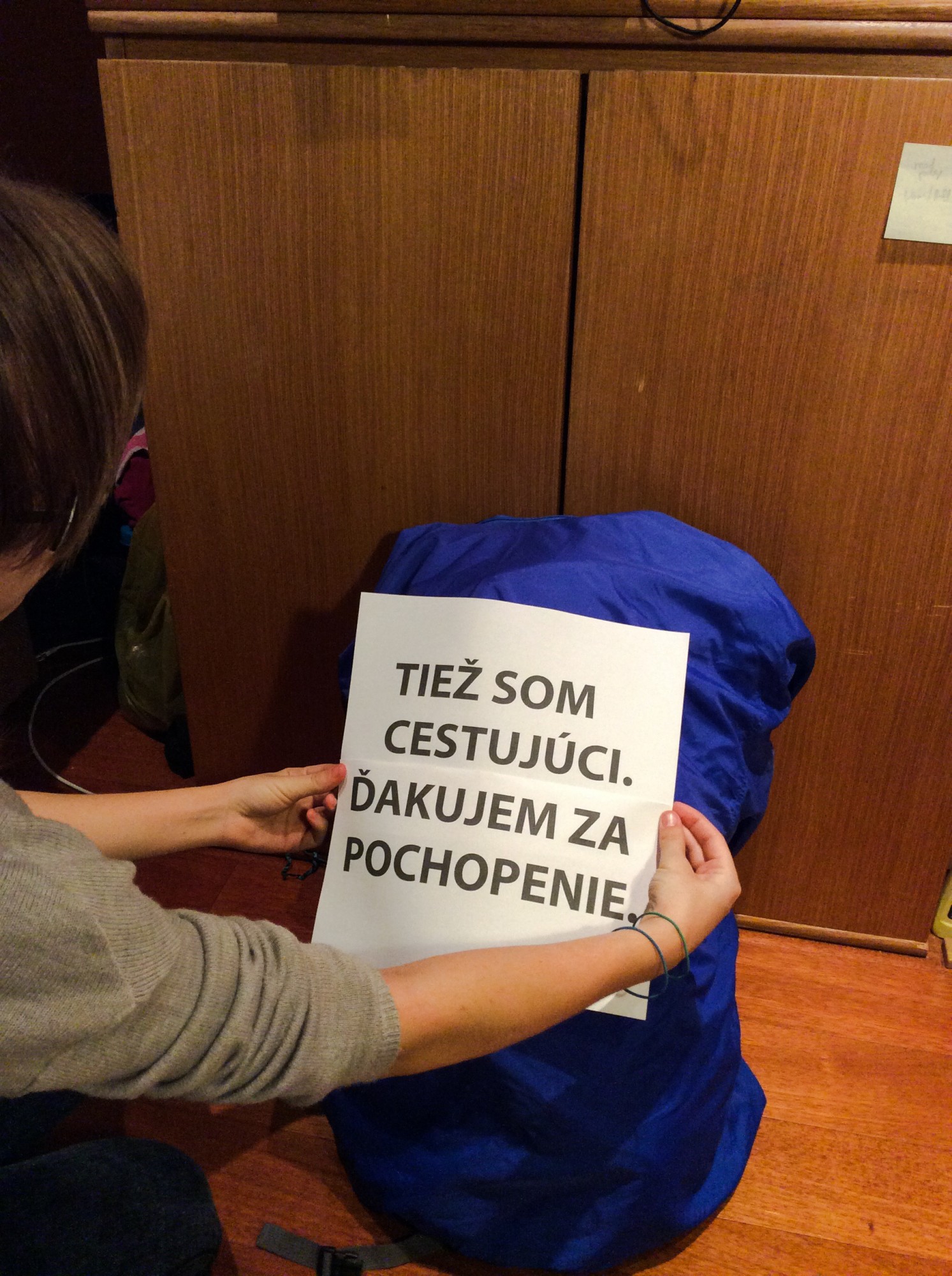 The problem we are experiencing is experiencing a woman with the stroller or a student with turbo suitcase, too. And still it is so simple to say pardon, please, thank you or excuse me. To smile, maybe using one hand or two is even more simple. Therefore I decided to simulate such situation - an innocent student with backpack, travelling to train station to catch the train. I wanted to see how much patience will passengers have when they get in contact with him. I put a sign on the back side of his backpack with the wording: "I am also a passenger. Thank you for your understanding and patience. It should appeal to the passangers next to him and make them think about the tolerance and understanding.