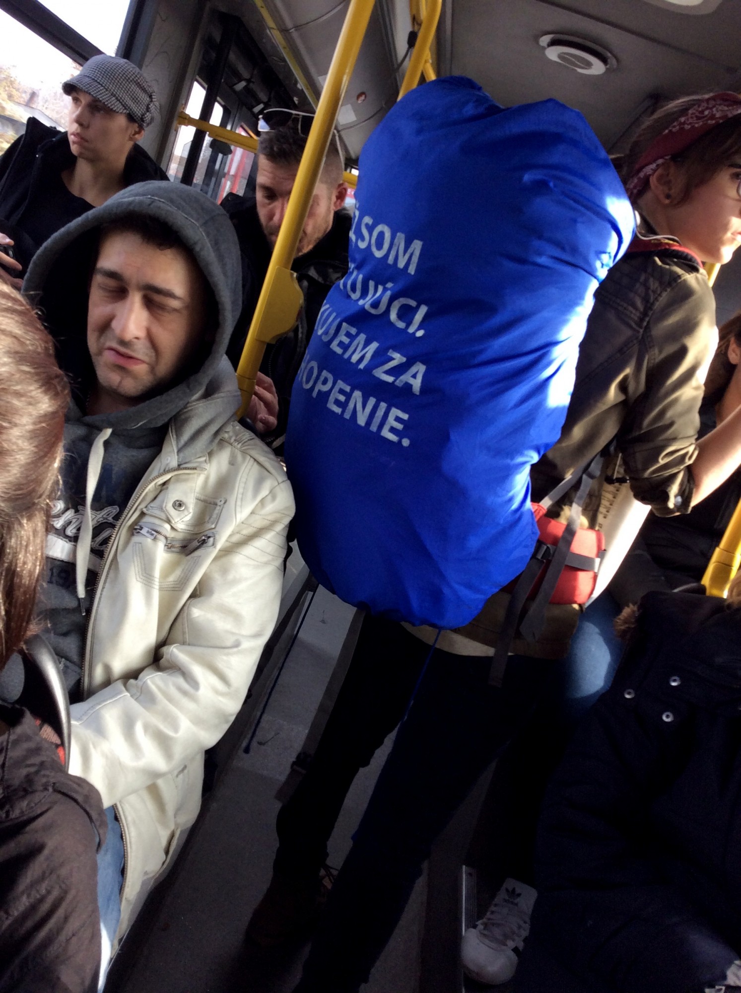 Unfortunately at the time of the implementation the bus was not so full and therefore there was not much confrontation exept few people looking and reading the sign. However no exact emotion was visible on their faces, I am sure it made them think.