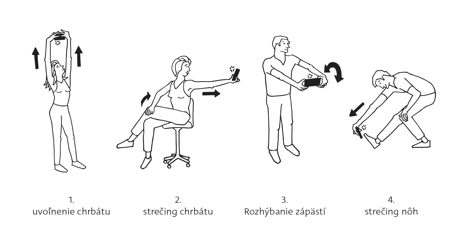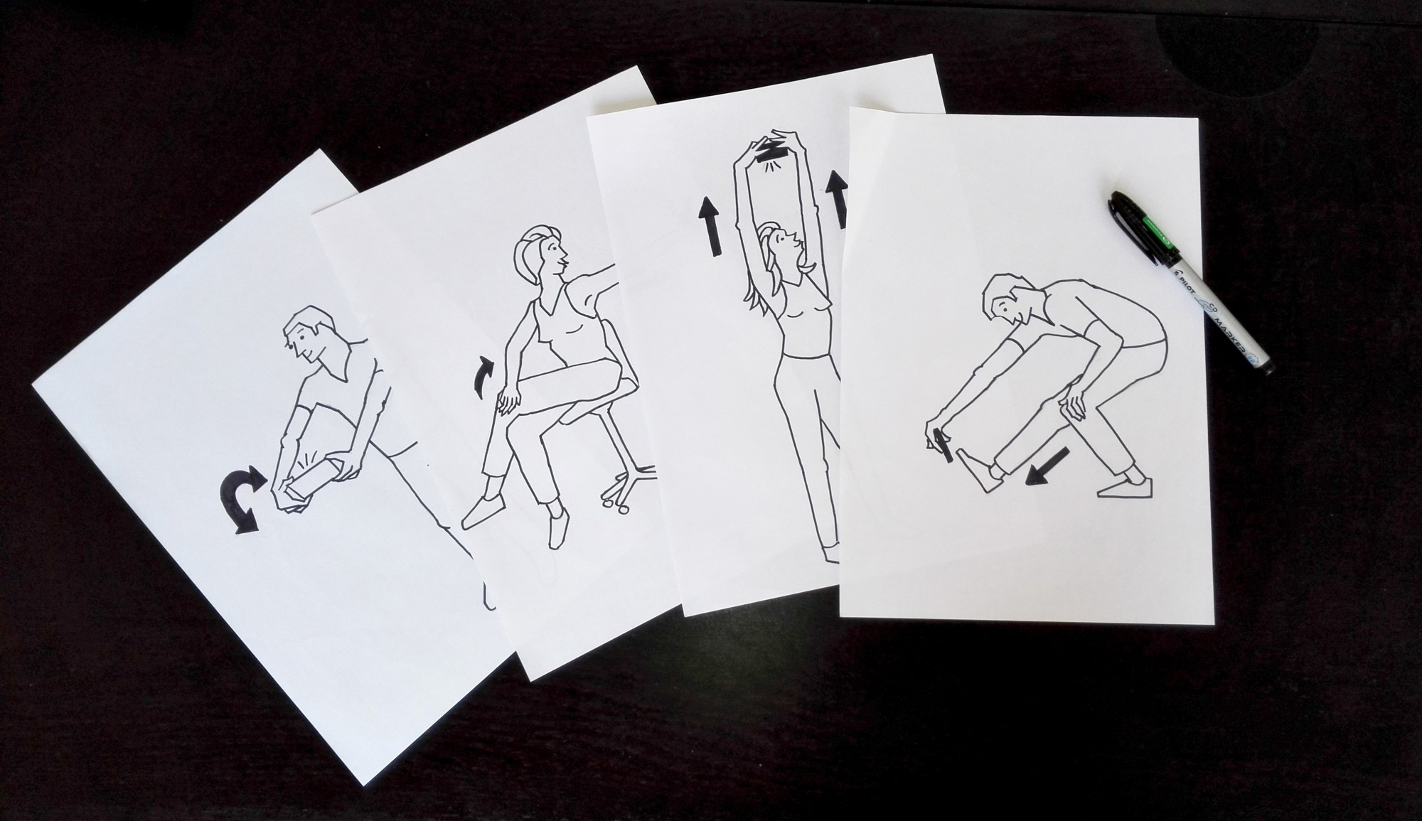 I wanted to solve the same problem but I wanted to use different media. People are often ashamed to exercise in public. Therefore I proposed a series of exercises that one can perform by himself. I used some stretching exercises to relieve neck, back and legs. Pain reduction is the fundamental motivation to perform