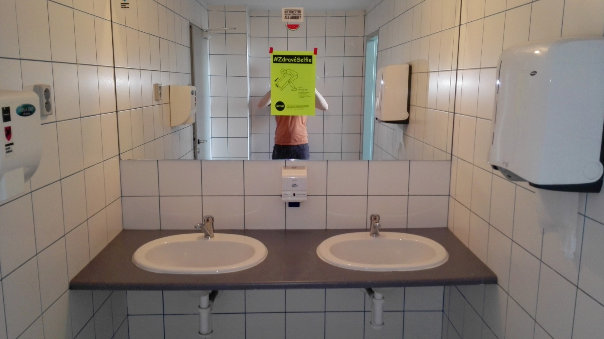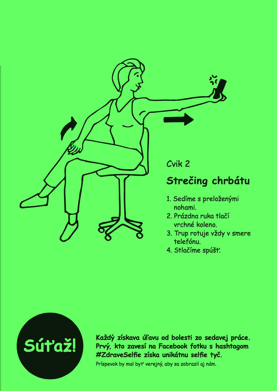 I created a poster and exposed and distributed them at my Academy. Poster contained a simple visualization of exercises and a short description. To increase the success rate have added info about the competition with a self rod for a winner. They should share these selfies with hashtag # ZdravéSelfie on Facebook because I wanted to test the success of the project. Unfortunately, this kind of motivation was not suficient enough to make them move and share it on FB.