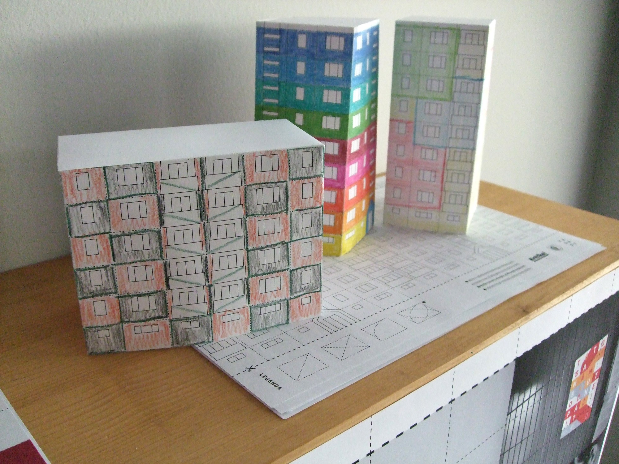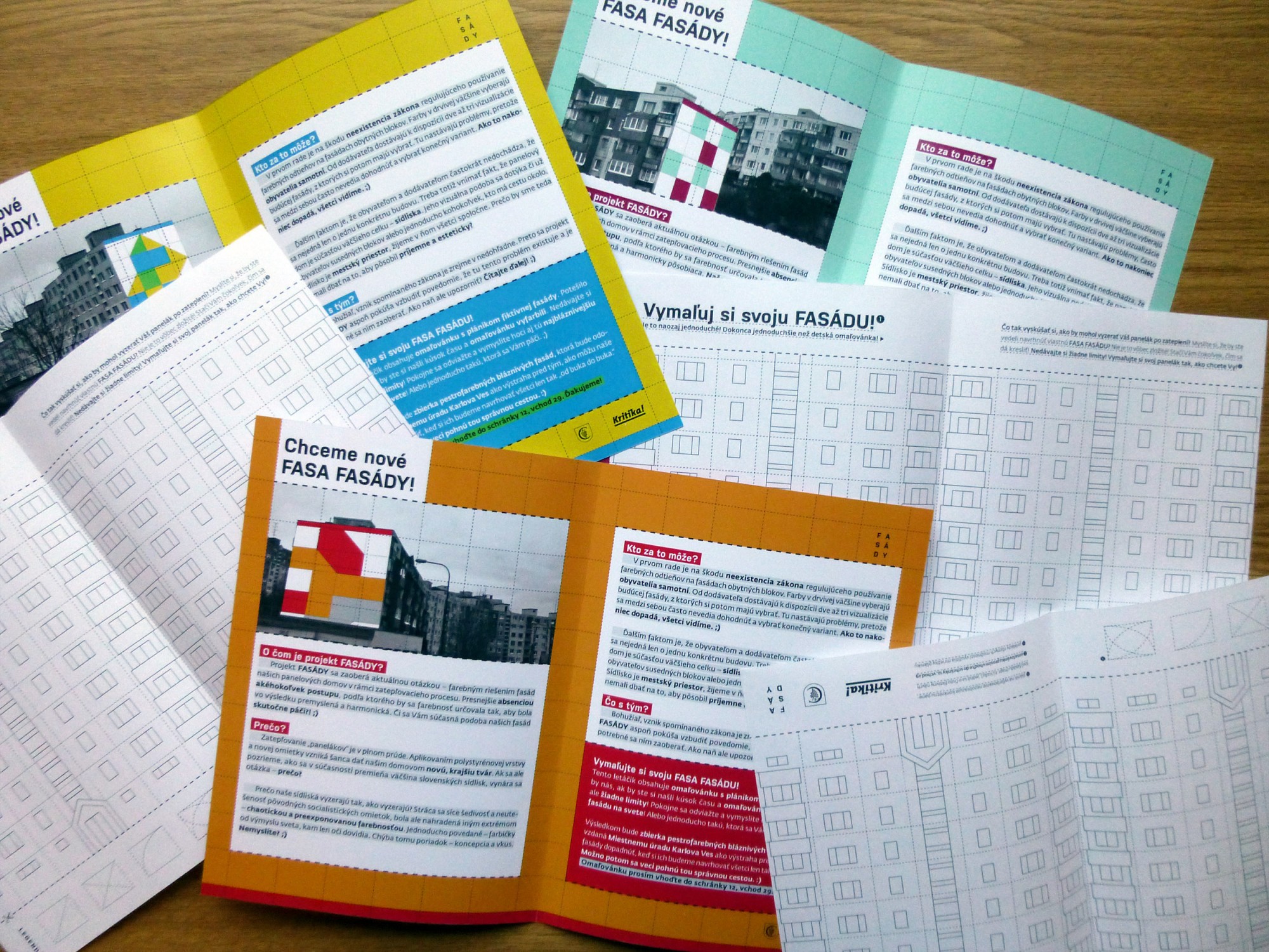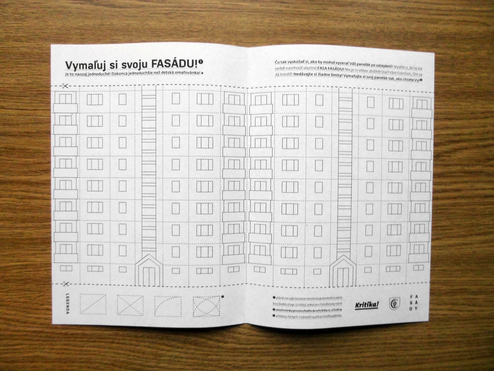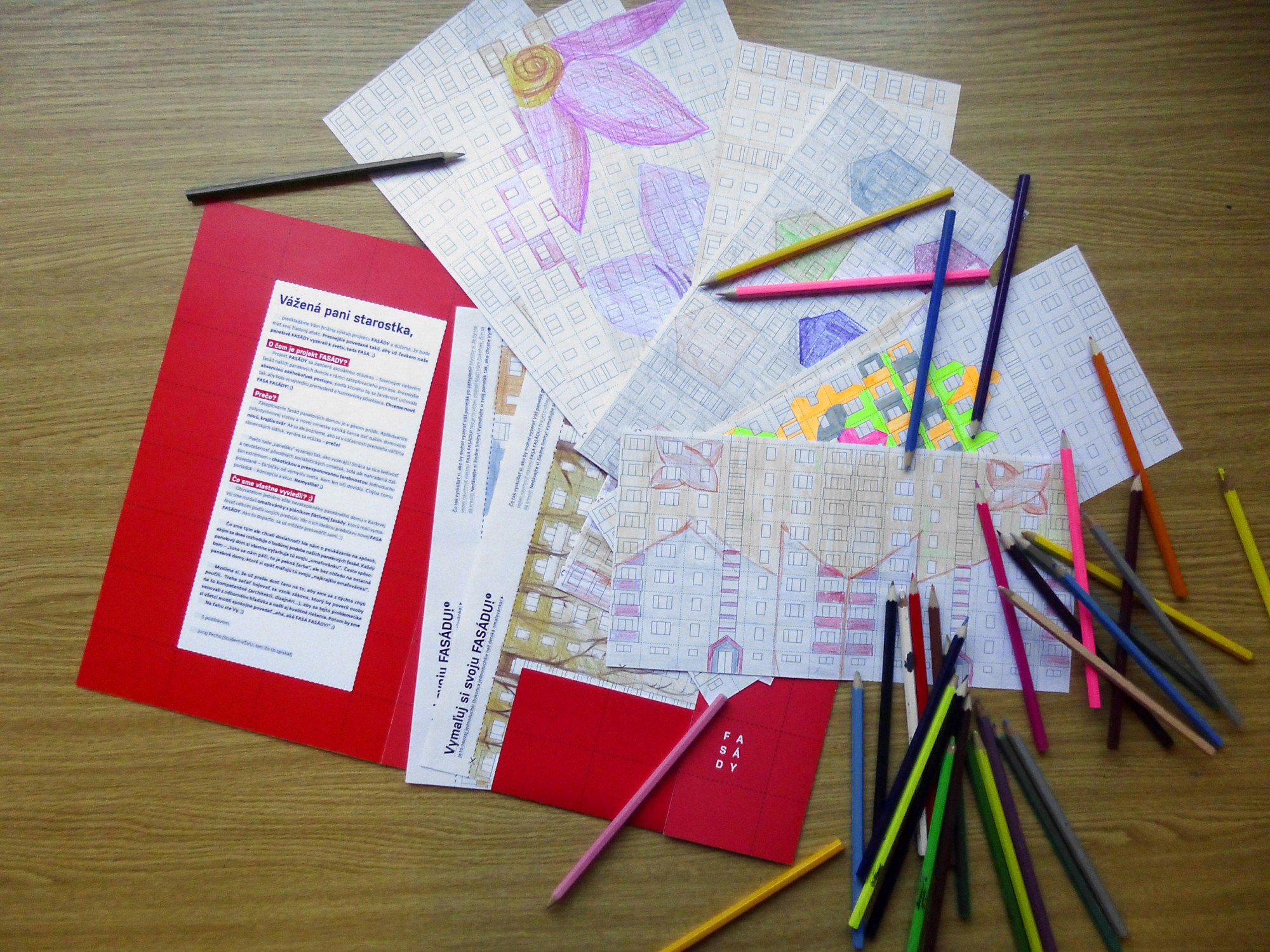I divided the project into two phases. The first was about the handing out leaflets (through personal contact from door to door) to residents of my block of flats in Karlova Ves, where I live. I've asked the residents of the house to colour the plans to suit their taste. Just as they liked and want. The plans contained different instructions and recommendations about the possibility of using the grid that a panel facade has to offer and how to fill them.
