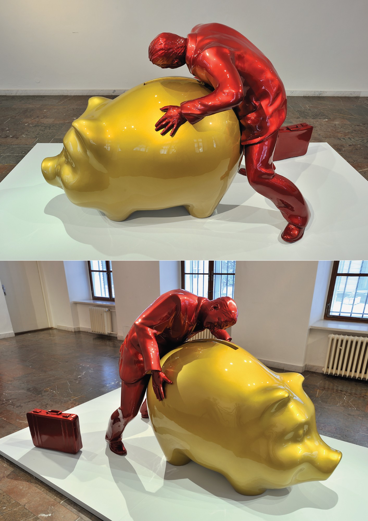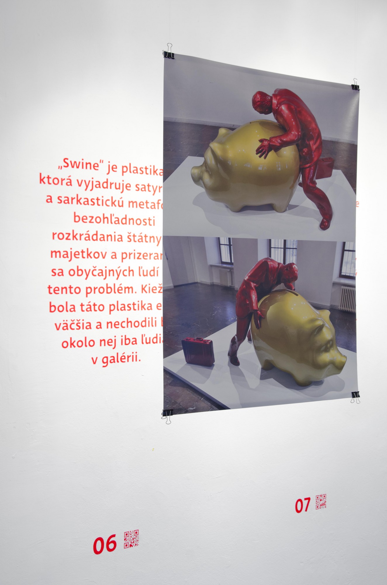 This project was a textual and visual reflection made by one of the students - Andrej Čanecký. Andrej reflected the work “Swine” created by his tutor Stanislav Stankoci in 2010. ”Swine is a sculpture that expresses satirical and sarcastic metaphor of the reckless theft of the state property and helpless watching of the ordinary people. I wish more people would have the chance to see this sculpture also outside the gallery where it was exhibited.”, says Andrej Čanecký in his textual reflection. He also included a visual reflection for his installation - he designed a poster using the image of the sculpture with a multiplying effect and presented it in augmented reality. The visitors could scan the QR code on the wall under his textual reflection and watch the video on tablet or mobile device.