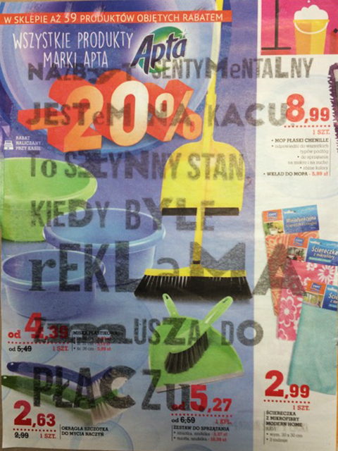 A Czech graphic designer and university teacher Pavel Noga has decided to reflect this situation. He found out that his mailbox contains about 2 to 3 kilograms of spam every week. Therefore he decided to use it as a material for his own project. He has used the original leaflets as a background for poetry texts of young Czech poets. After printing the poems on the leaflets, he returned them back to the mailboxes.
