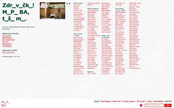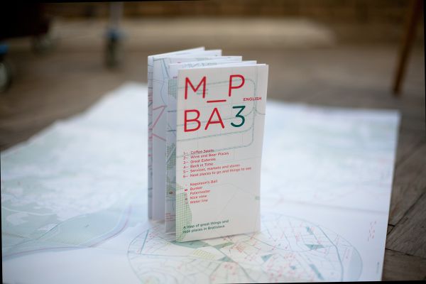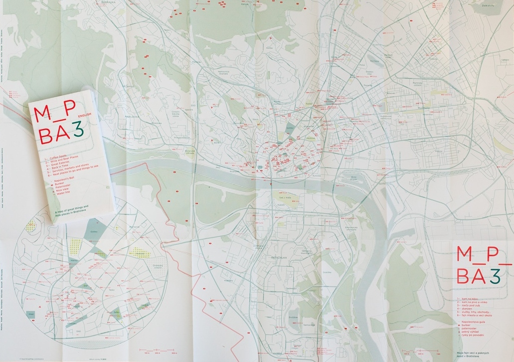 The alternative tourist guide created by the graphic designer Pavlína Morháčová named M_P_BA contains a list of unconventional spots located in Bratislava. The author, alongside with other locals of Bratislava, draws user's attention to these places and provides an authentic description from a subjective point of view. The map, originally created in 2010, can be found on a webpage, but it is also produced in a form of a paper map.