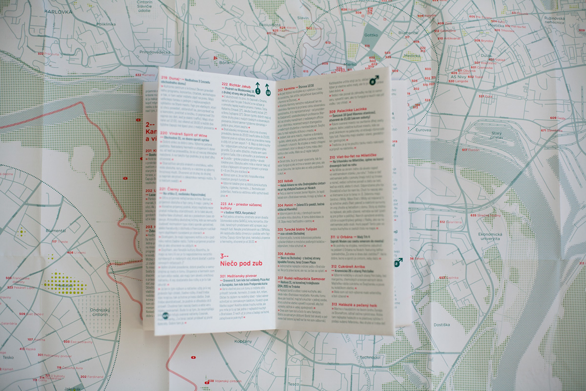 Bratislava has many shortcomings, everyone can still find plenty unique places, getting a chance to discover new locations according to his or her specific requirements. The guide, which is primarily intended to the inhabitants of Bratislava, provides new insights and inspiration to people, who live in the city their whole lives. However, one has to be aware of the fact, that the map is based on the subjective point of view of the author that may not correspond with the taste of the user. I rate positively, that the English version of the map is adjusted for foreigners, who are not familiar with the city and that it contains names of the streets as well, while the Slovak version navigates only by sites known mainly to locals.