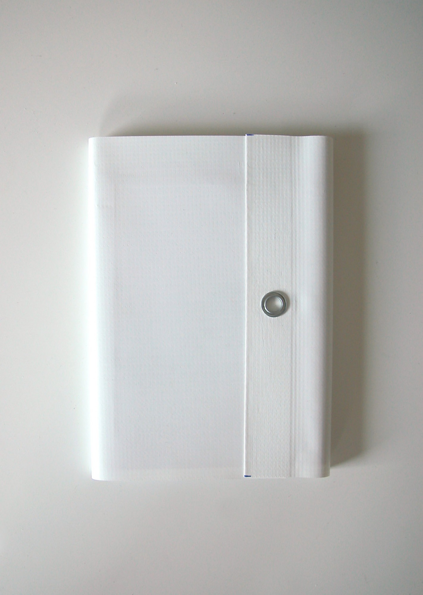 The structure of the book was following the structure and design of the exhibition setup and exhibition space. The soft cover was made out of the plastic banner - an outdoor advertisment of the exhibition that was hanging on the front fasade of the Museum. So each soft cover was unique piece of recycled add.