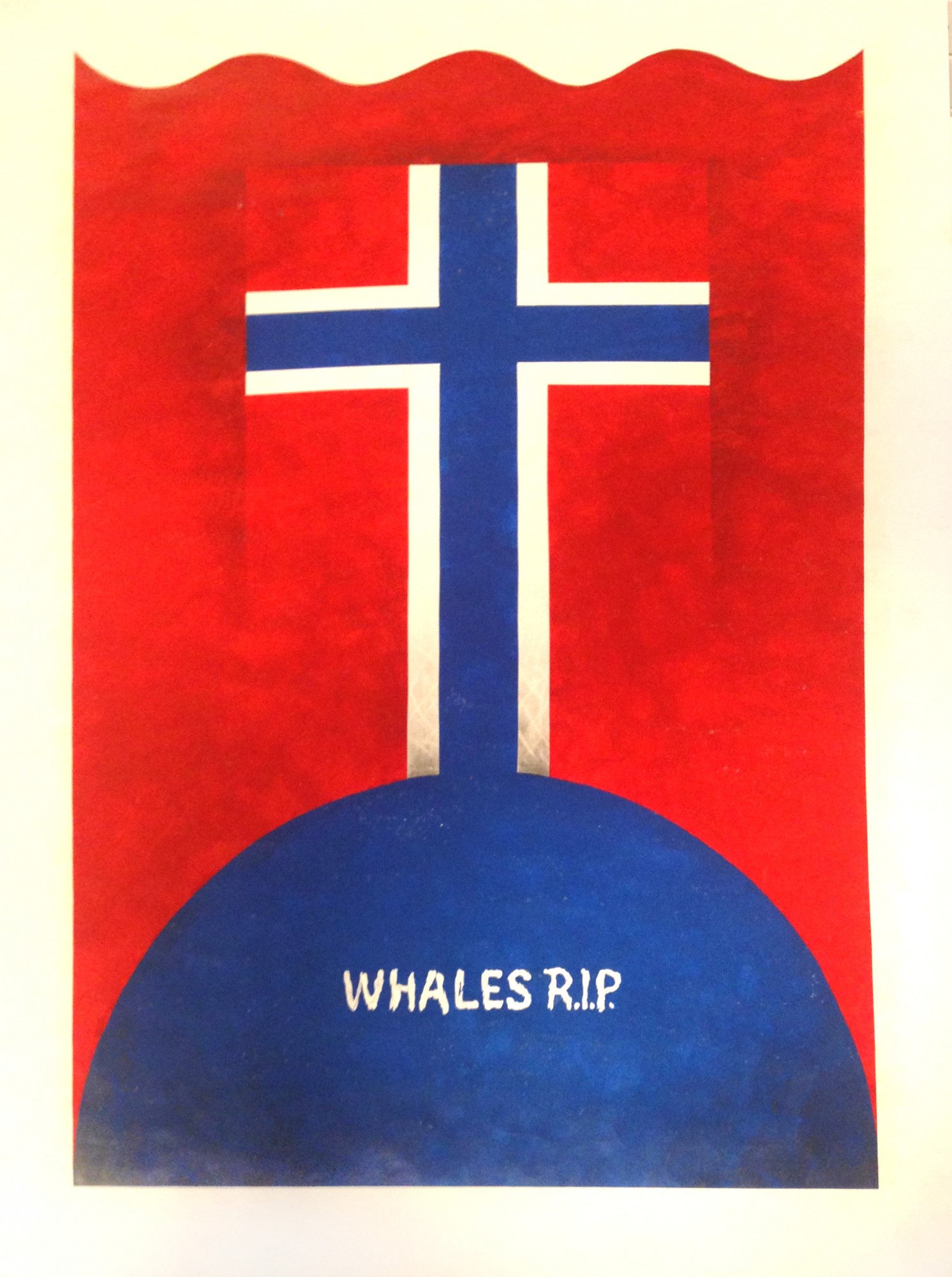Next one is "Whales RIP". It reflects mass killing of whales in Norway. Turned flag of Norway is shown as a cross - typical symbol of death.
