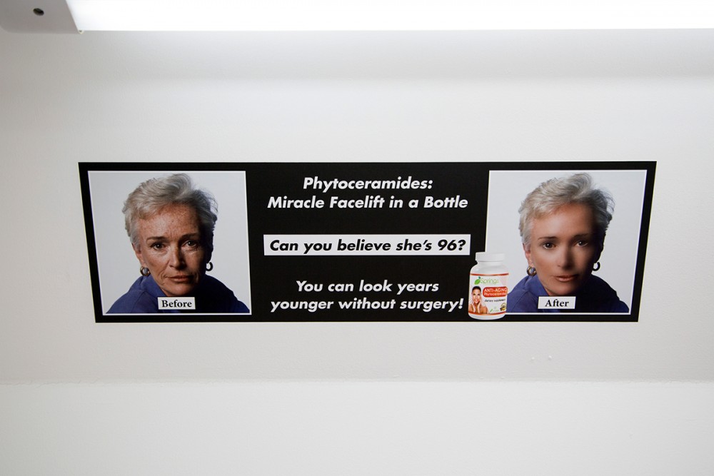 After walking into the caravan, we were greeted with white space with messages on the walls. Inside, we found items designed to hurt us or others. That was one of the first messages we saw when walking into the space. The objects there include less-lethal weapons, anti-sit benches, and humane slaughter methods. One video was called Wearable Terminal. In this video we saw employees using items such as: anti-skateboarding studs, anti-sitting benches, and anti-homeless spikes; all examples of social cleansing architecture.