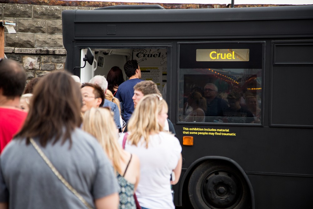 When we visited Dismaland, there was a massive queue; so we decided that we might as well just wait our turn to get in. To make this experience easier and to help pass the time, one of the staffers read excerpts from various books. At one point, there were “lovely” words from a book on the processes of animal testing.