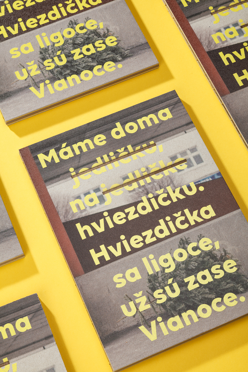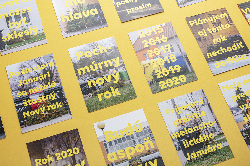 Looking at the wasted trees becomes a forced social ritual that seems absurd without the context of previous events. We tend to forget that there are also large numbers of inhabitants on this planet with different lifestyles and religions. The Christmas poems in the book that accompany the photographs of discarded trees have a similar function to the trees themselves. They all contain the word ‘tree’ or its synonyms. Deleting them is supposed to exacerbate the loss of meaning of the whole poem, just like the gesture of a thrownaway tree reflects the loss of the Christmas atmosphere. The font Volte BOLD was chosen for the lyrics, which fits into the whole concept thanks to its minimalist yet strong style.