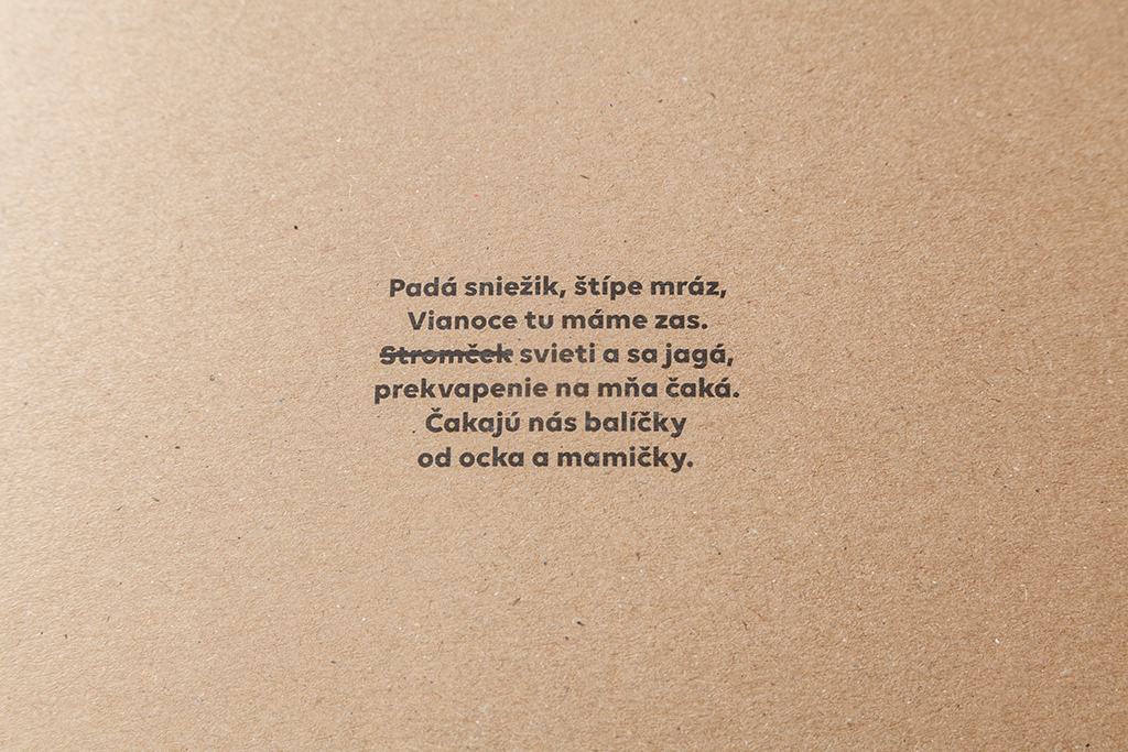 The book itself is made using strictly environmentally-friendly materials and traditional techniques, including bookbinding. The material side of the project also contributes to the message as such. It is housed in an envelope made of raw cardboard, with a print of a photograph and a Christmas poem in which tree-related words are engraved.