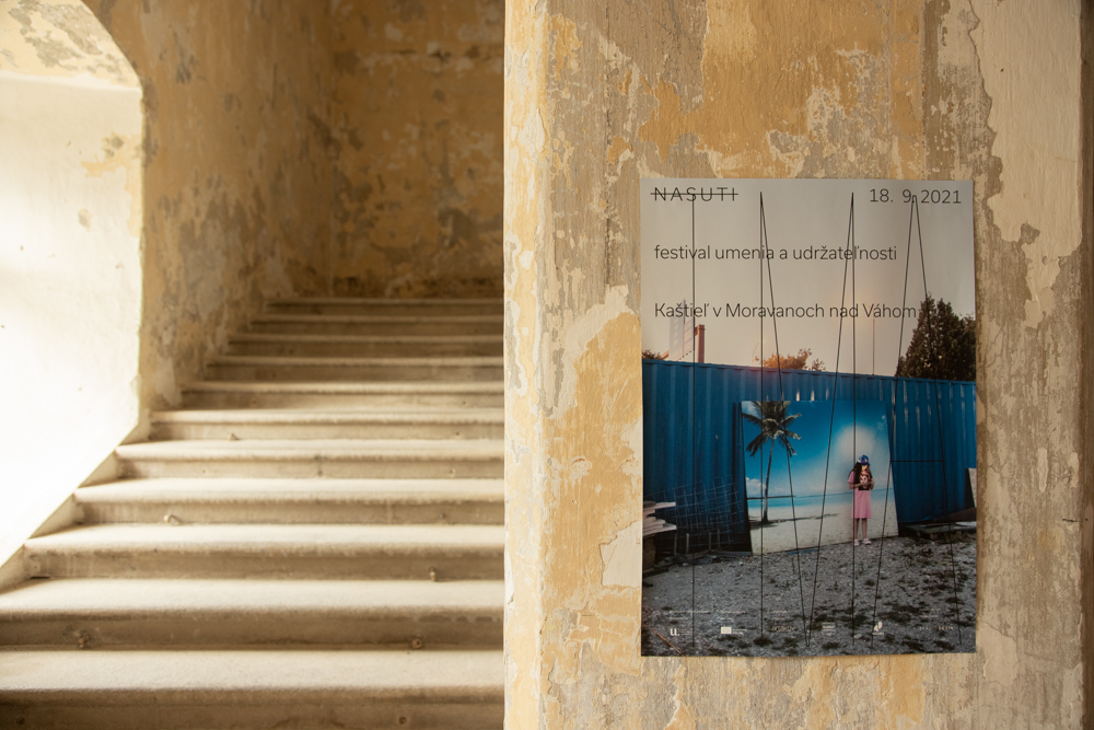 For the festival’s communication design, curators Zuzana Duchová and Diana Klepoch Majdáková, together with graphic designer Peter Liška, decided to reuse two photographs from previous editions. Using these existing photos for the posters is also an act of saving, of not inducing more and more production and energy usage. Both of the images depict natural light/darkness in combination with artificial light, carrying a disturbing message. The photo by Matej Hakár from 2017 was taken in an undefined suburb. It shows a girl absorbed by the light of her phone, standing next to a steel panel on a construction site, directly in front of a large canvas with an idealistic image of a beach. A strange scene that can be read as a metaphor of Western society — desiring a beach paradise but actually looking in a different direction.