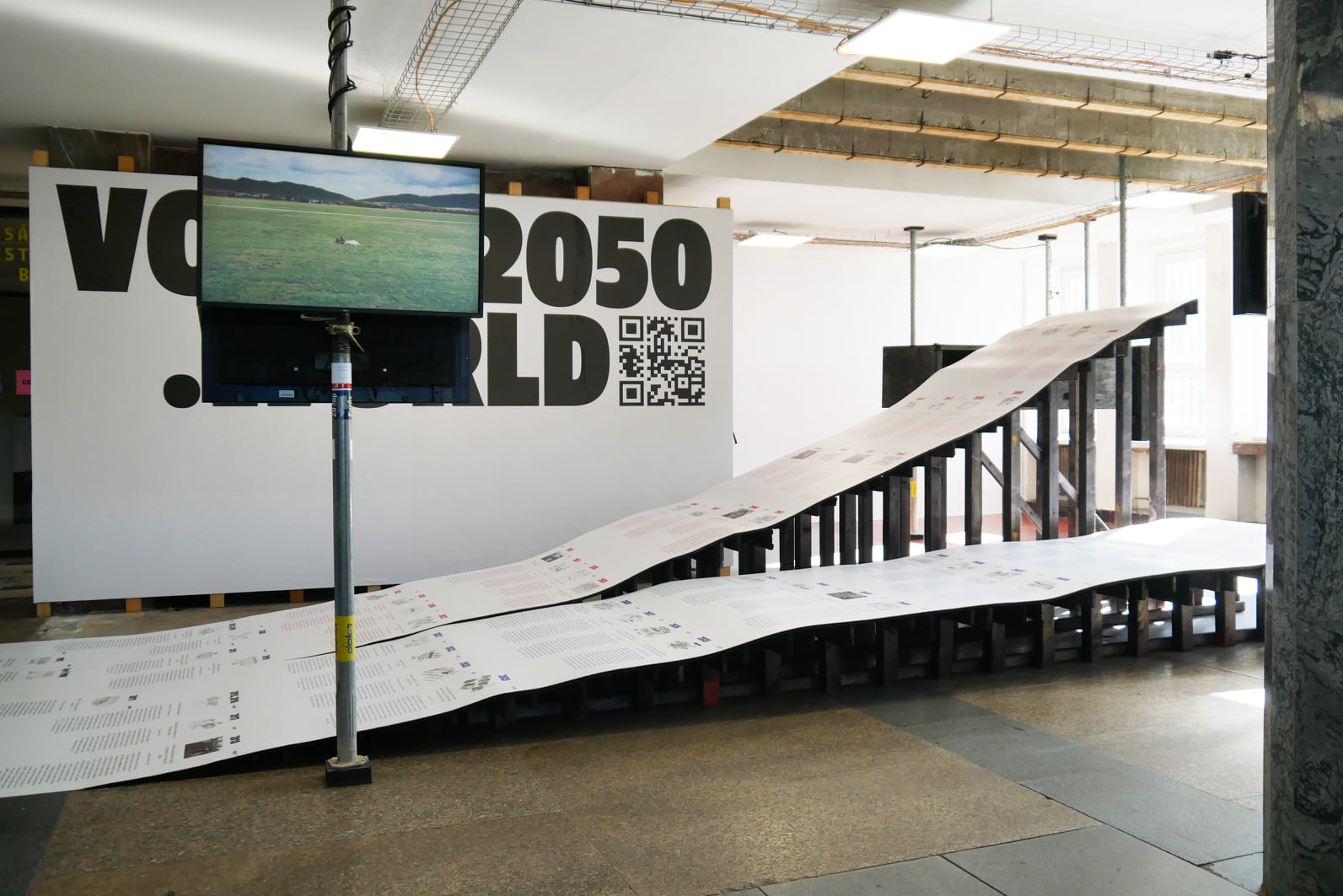 A simplified visual aid is provided here. Two ‘sidewalks’, two extremes of possible futures, are plotted in a curved form, as physical ramps with surface graphics. Two timelines spanning from 2020 to 2050, stating assumptions for the development of an uncertain future. These scenarios take into account both positive and negative developments with regard to climate change and the survival of the human species on Earth.