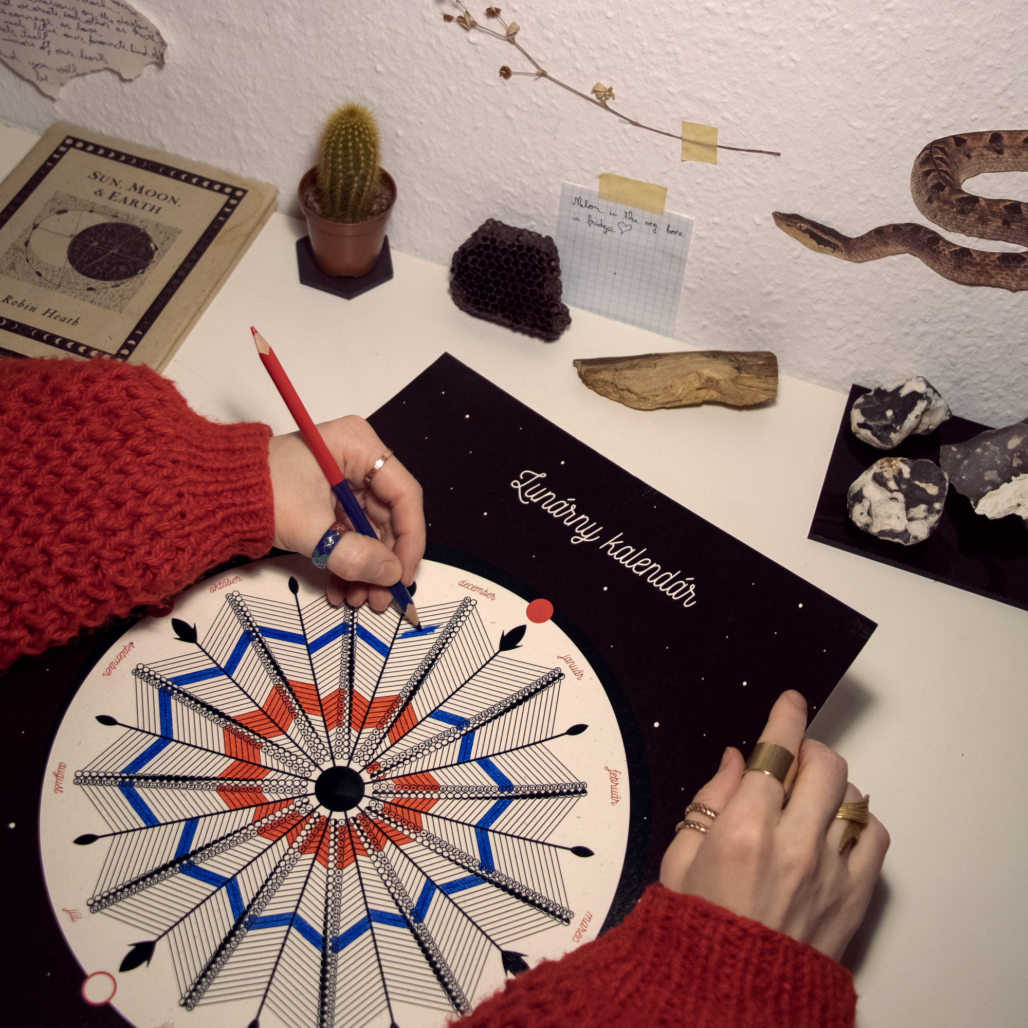 Mesačnica continues to develop more tools that advocate for body literacy. Its lunar calendar is designed to promote a positive relationship with one’s menstrual cycle through the ritual of monthly chart-making, learning about the patterns and observing whether there is a correlation with the lunar cycle. This works by means of a circular layout, offering the possibility to colour-in the days of menstruation and any other observable cyclical signs, such as ovulation or PMS. If the calendar is used regularly, a personalized visual representation of one’s cycle appears in the form of a mandala.