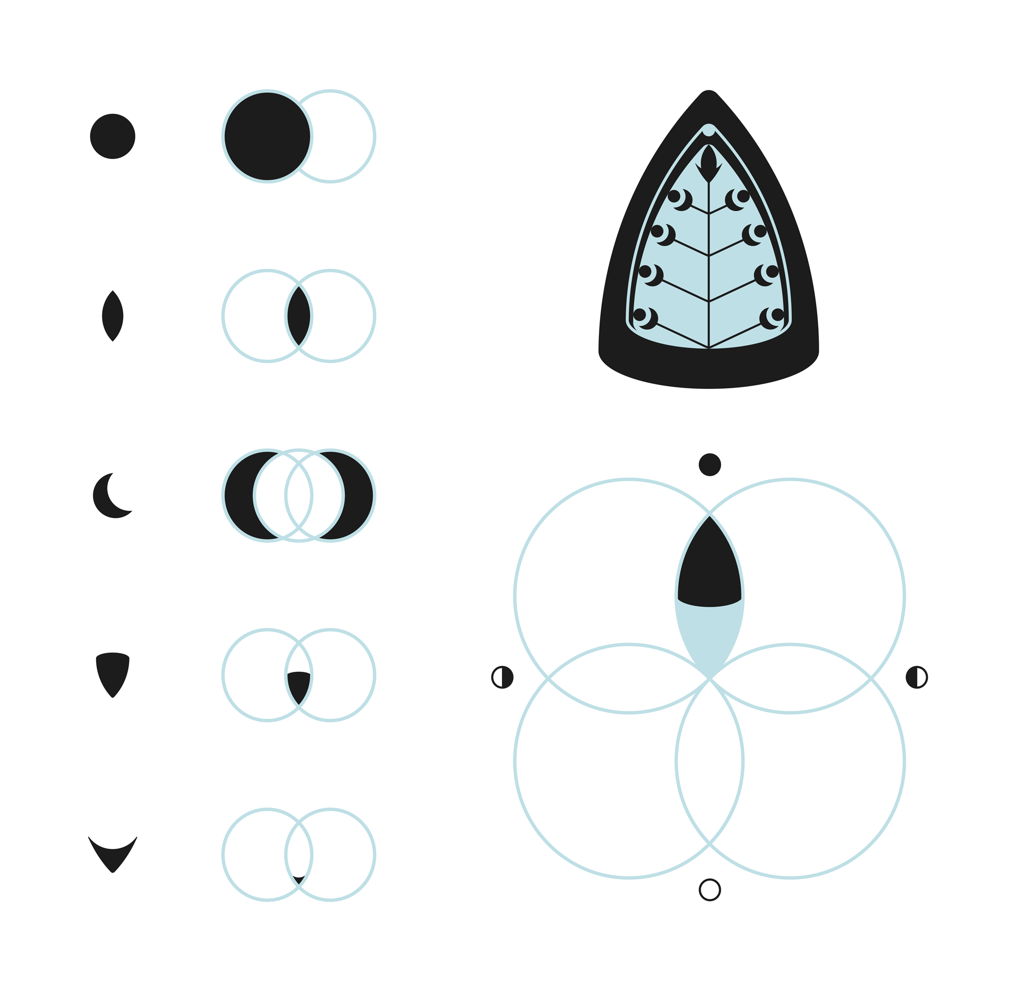 The main elements were conceived as an overlap of geometric shapes extracted from three sources: the menstrual cup, the phases of the moon, and the yoni symbol, all of which are embodied in the physiology of the Lunaria. Its central alignment and mirrored symmetry further enhance the depiction of the balancing nature of monthly cycles.
