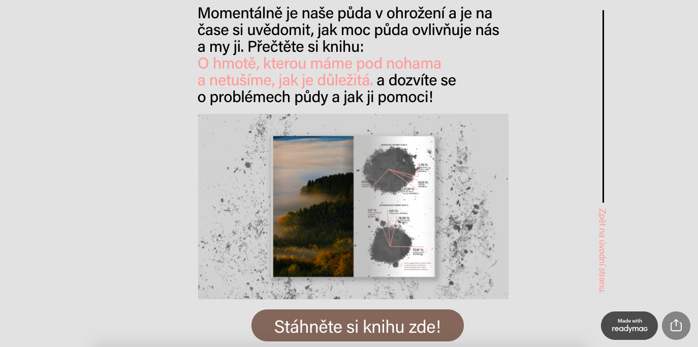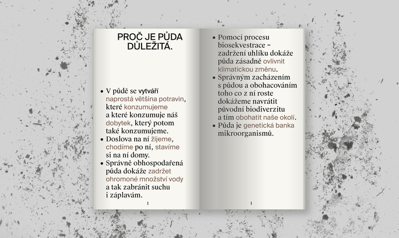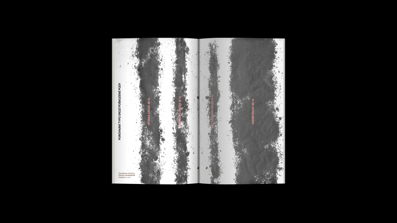 The project O hmotě, kterou máme pod nohama a netušíme, jak je důležitá [About the matter under our feet and that we have no idea how important it is] deals with this topic, whose author is Oskar Koutný. In this publication, Koutný reveals the research and points out the problem. It was produced last year in the graphic design and visual communication studio at UMPRUM in Prague.