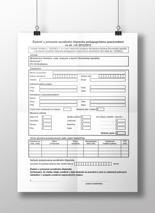 Poster as part of critical practice class in Academy of Fine Arts and Design in Bratislava. This poster is a reaction to salary problemsof teachers in Slovakia - poster was created during protests that were happening around the whole country. It is based on social scholarship application form for students that can be asked from the government. This one is turned into application form for teachers to show how much they earn compared to how much money they need for living. Can they continuework hard when they know they barely survive on the salary they get?