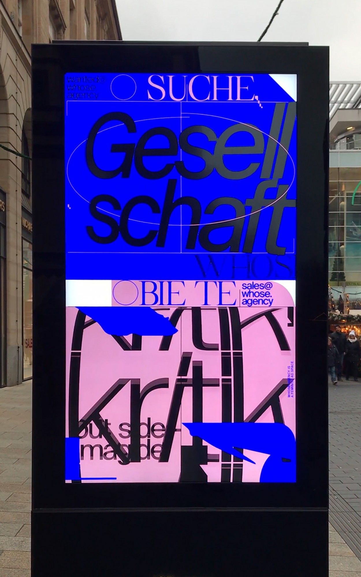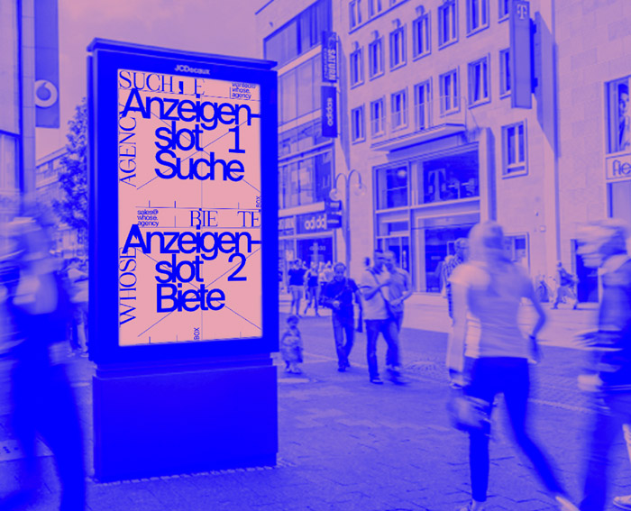 Utilising Leipzig’s Digital City Light Posters as a medium for signage, WHOSE.AGENCY predominantly created the brand staging for commercial entities such as Parship, H&M, City-Branding, et al. Digital City Light Posters provides large-format, stand-alone screens installed on retail-dense streets, which enable the use of moving images. For the visual translation of classified ads, Kaiser worked within a purely formal typographic framework, with the goal to tackle the visual environment and demand a share of the market on the agency’s own terms.