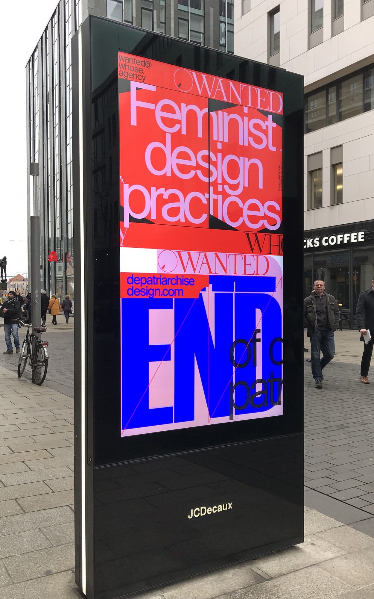 WHOSE.AGENCY is a digital advertising campaign operating on the streets of Leipzig. Created by German graphic designer Anja Kaiser, the project describes an informal advertising agency that works exclusively for feminist resistance by designing high-quality classified ads. It was awarded the INFORM award for conceptual design in 2017. Kaiser used the funds from the prize to set up her website and digital platform in order to promote feminist causes and support digital self-empowerment.