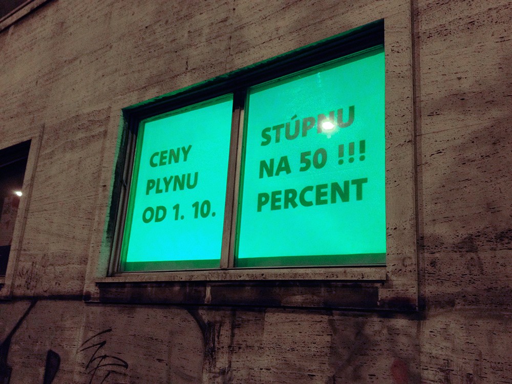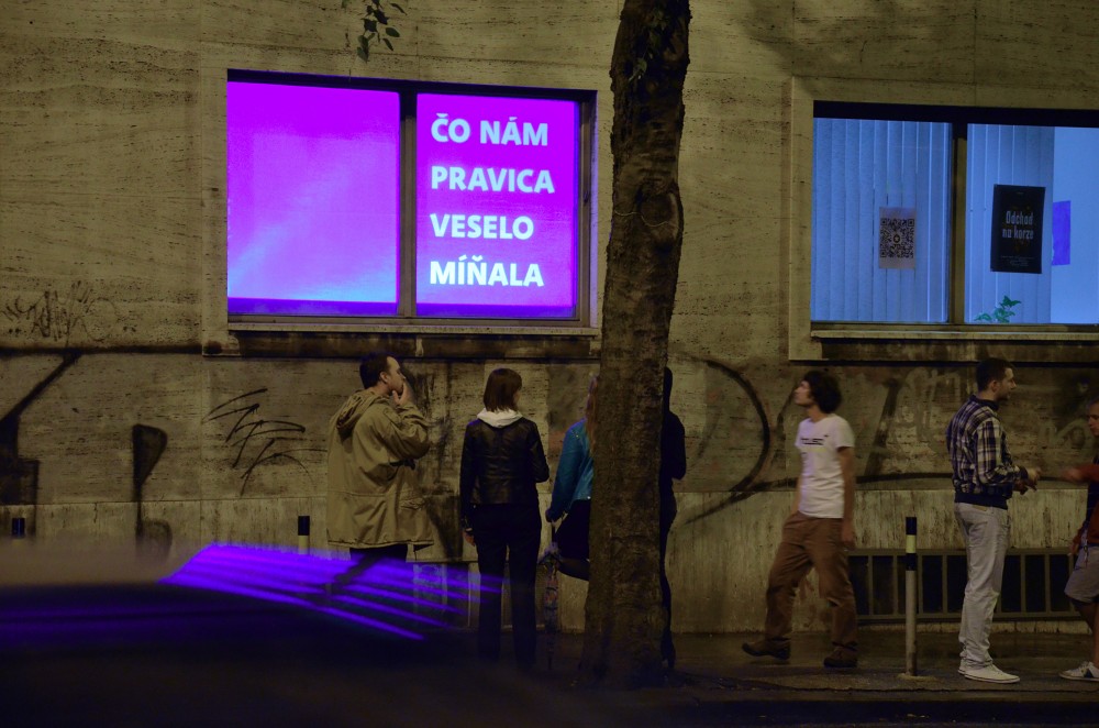 Critical window is original format of short critical visual reflections made by graphic designers and projected onto the street from three windows of the culture and co-work space called Foajé on Štefánikova street in Bratislava. They used to reflect the current critical political or social issues that resonate in Slovakia. Sometimes they are related with the public events organised inside the Foaje showing the personal critical attitude of their authors towards certain topics of these events.