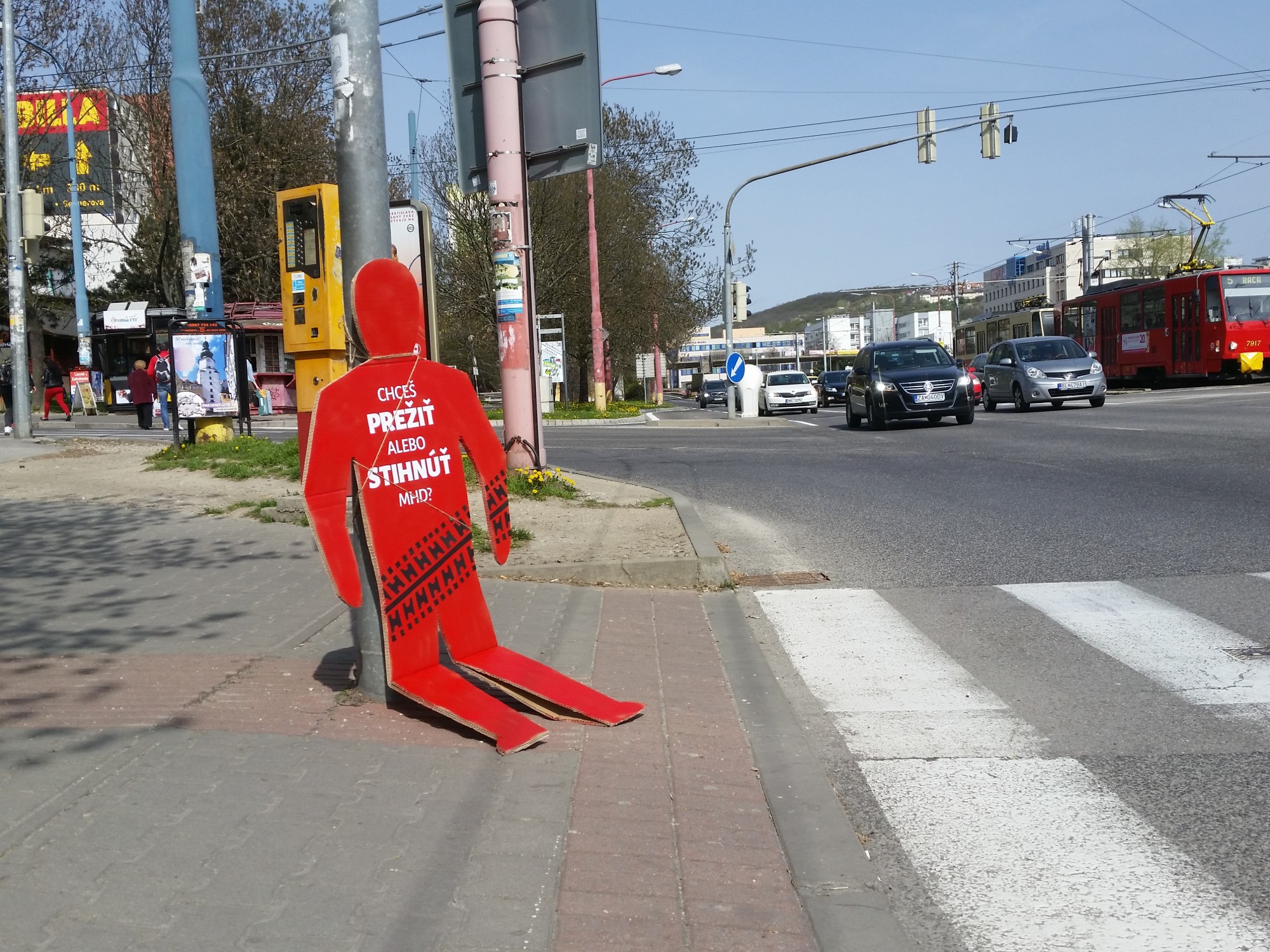 Therefore I decided to respond to this situation and I used red figure from the traffic light that people ignore as a sign and a warning. To make it more visible and real looking I did it the size of a man. The puppet was wearing a very direct and brutal message "Do you want to live or catch public transport?". Ii was installed on different locations within the intersection and in the field of vision of people waiting on the footpath, but people nonetheless went red.