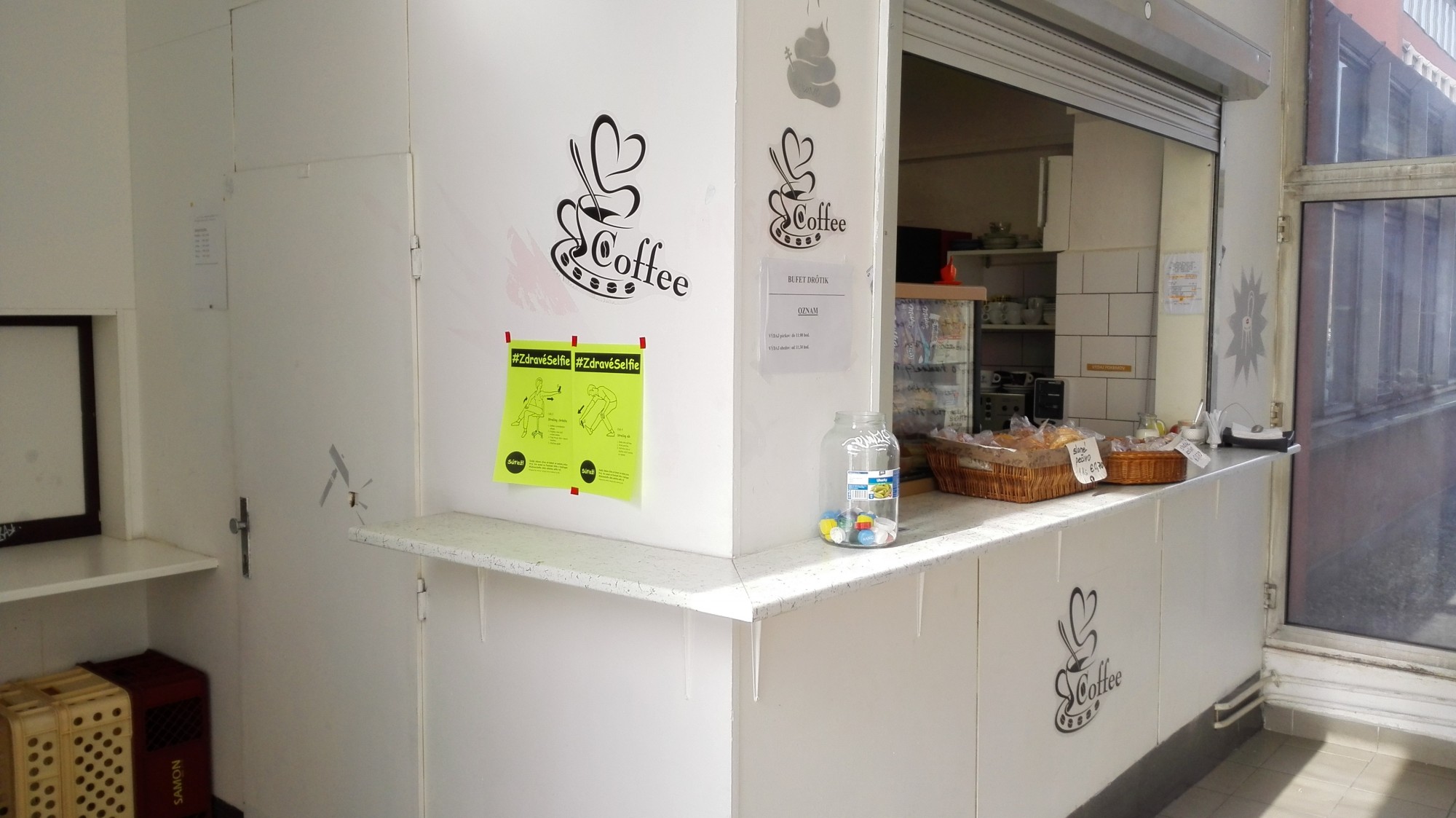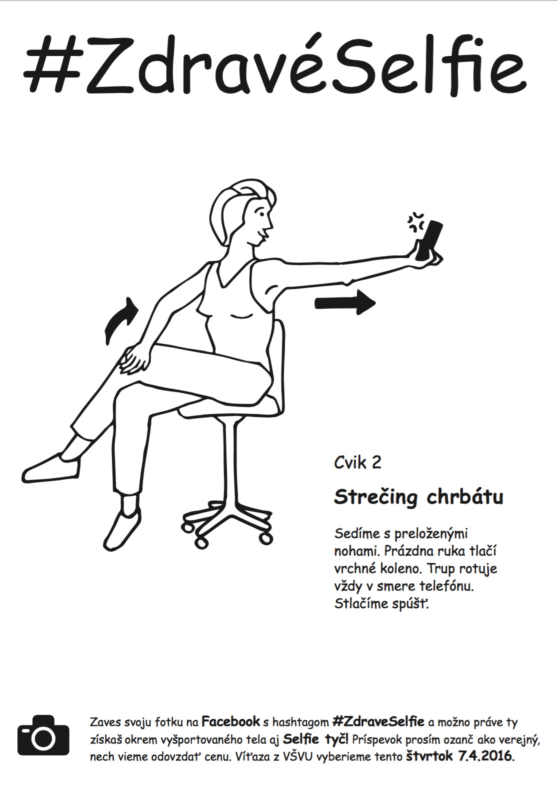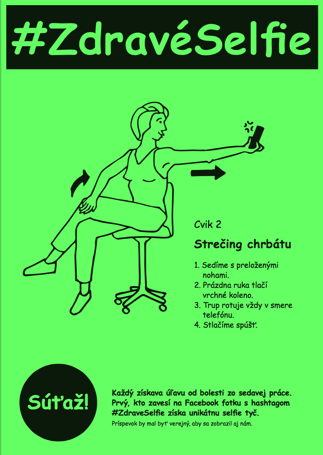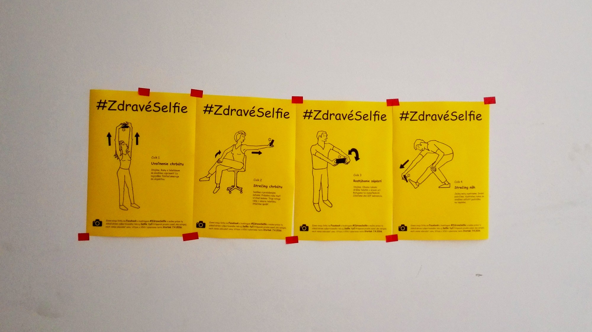 I created a poster and exposed and distributed them at my Academy. Poster contained a simple visualization of exercises and a short description. To increase the success rate have added info about the competition with a self rod for a winner. They should share these selfies with hashtag # ZdravéSelfie on Facebook because I wanted to test the success of the project. Unfortunately, this kind of motivation was not suficient enough to make them move and share it on FB.