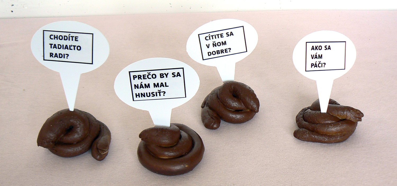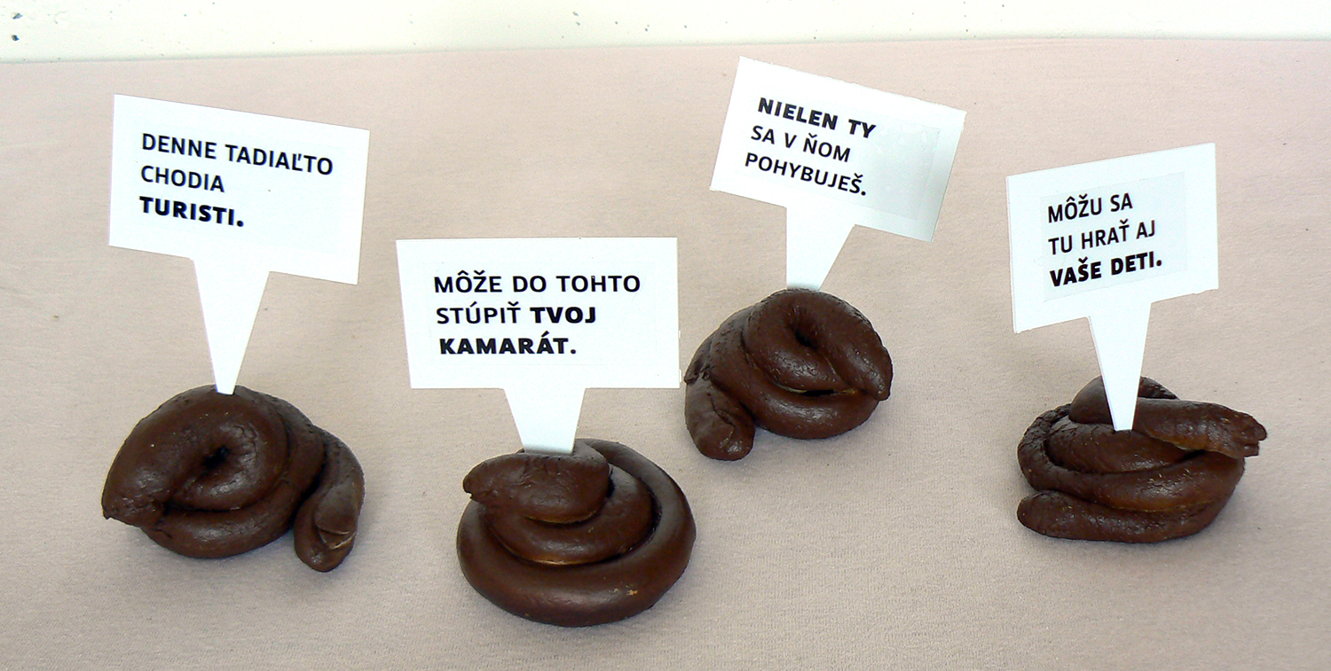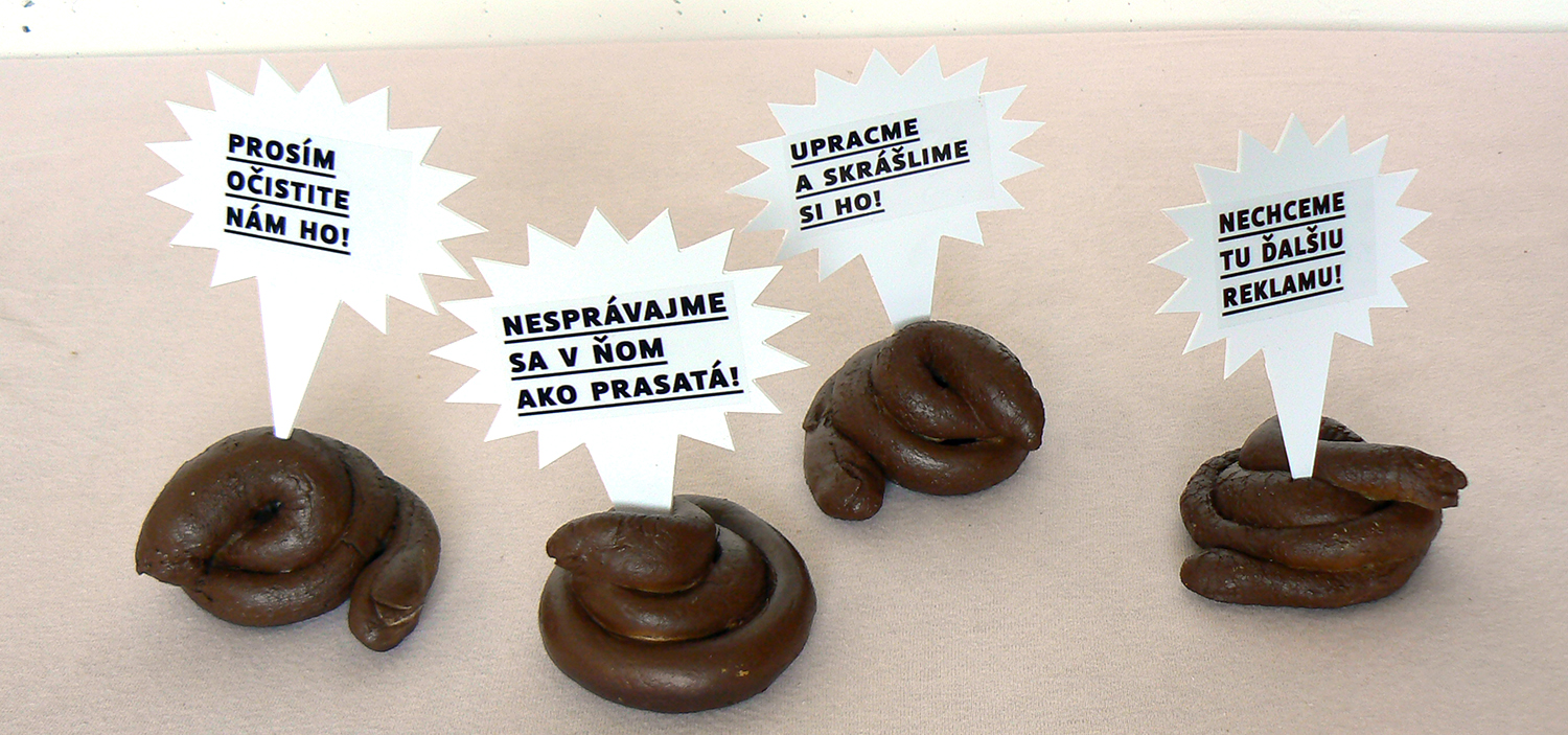 I created a campaign specifically focused on those who are moving in public places. I placed all sorts of signs with messages on the selected areas in Bratislava that are most problematic. I have conceived four different levels of communication - calls for action, questions, announcements and PF wishes. The headlines had reflect a variety of problems - from affordable queries, questions if people feel good, to appeals not act like pigs. As a main medium of communication I created a object that looks like a dog poo. It should attract the attention, make people stop and think about their behaviour in public space.