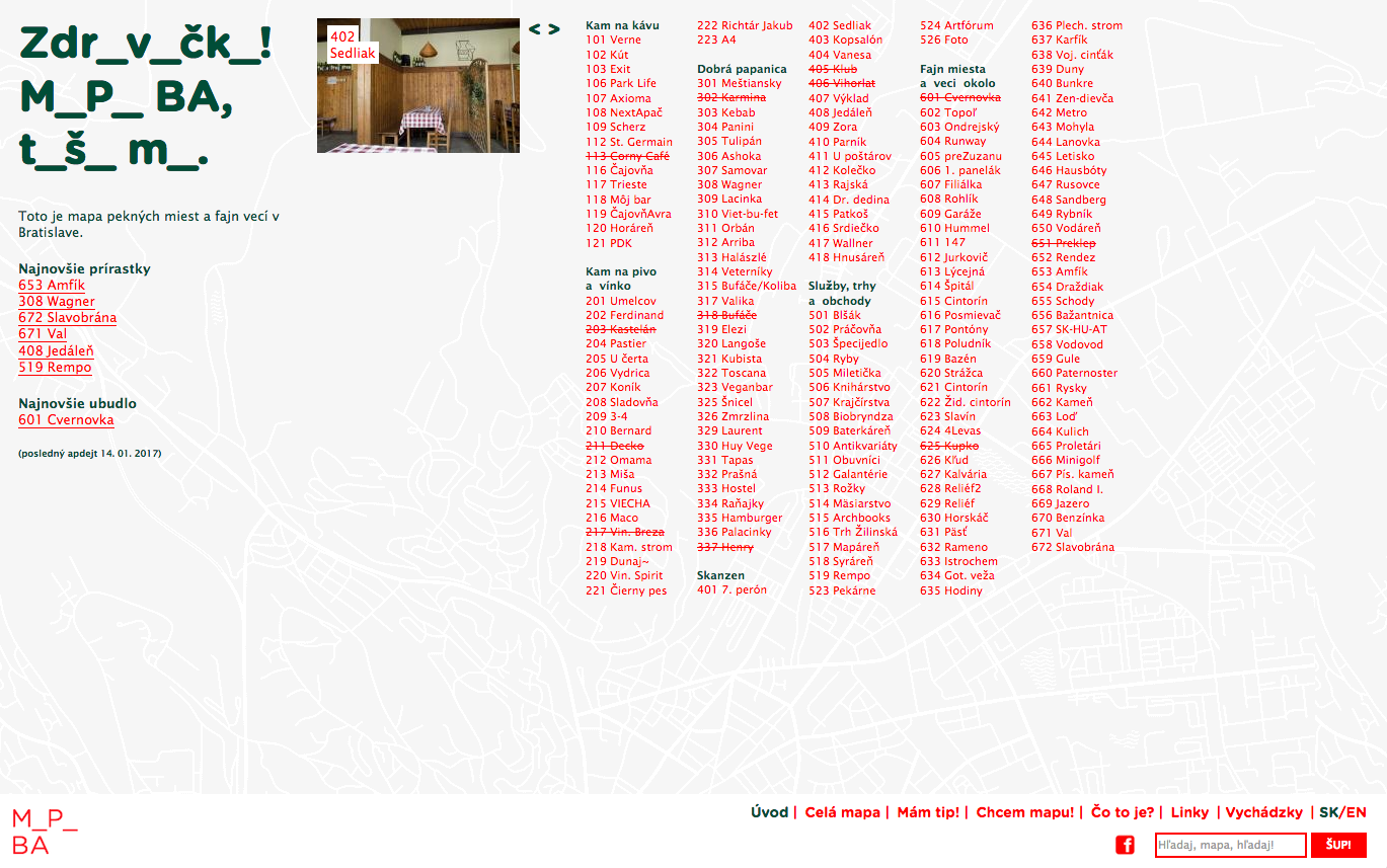 I appreciate, that the M_P_ BA website is regularly updated, among others due to the advice of its users, however all updates have at first be approved by the author. The webpage is about to get redesigned, so as to become clearer and more user-friendly for smartphones and tablets. I would recommend including an additive filter option allowing more specific categorization of places so that people could find what they are interested in even faster and easier. The map was created with honesty, pointing at the fact, that even though