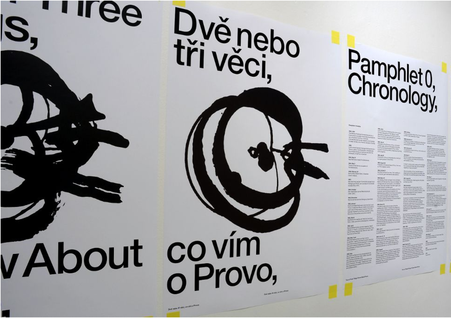 This exhibition, „Two or Three Things I Know About Provo” was focused mainly on him. The exhibition was conceiving as incomplete archive of materials. The concept of archive was showed in the special arrangement of exhibition - plenty of papers were sticked on walls with tape.