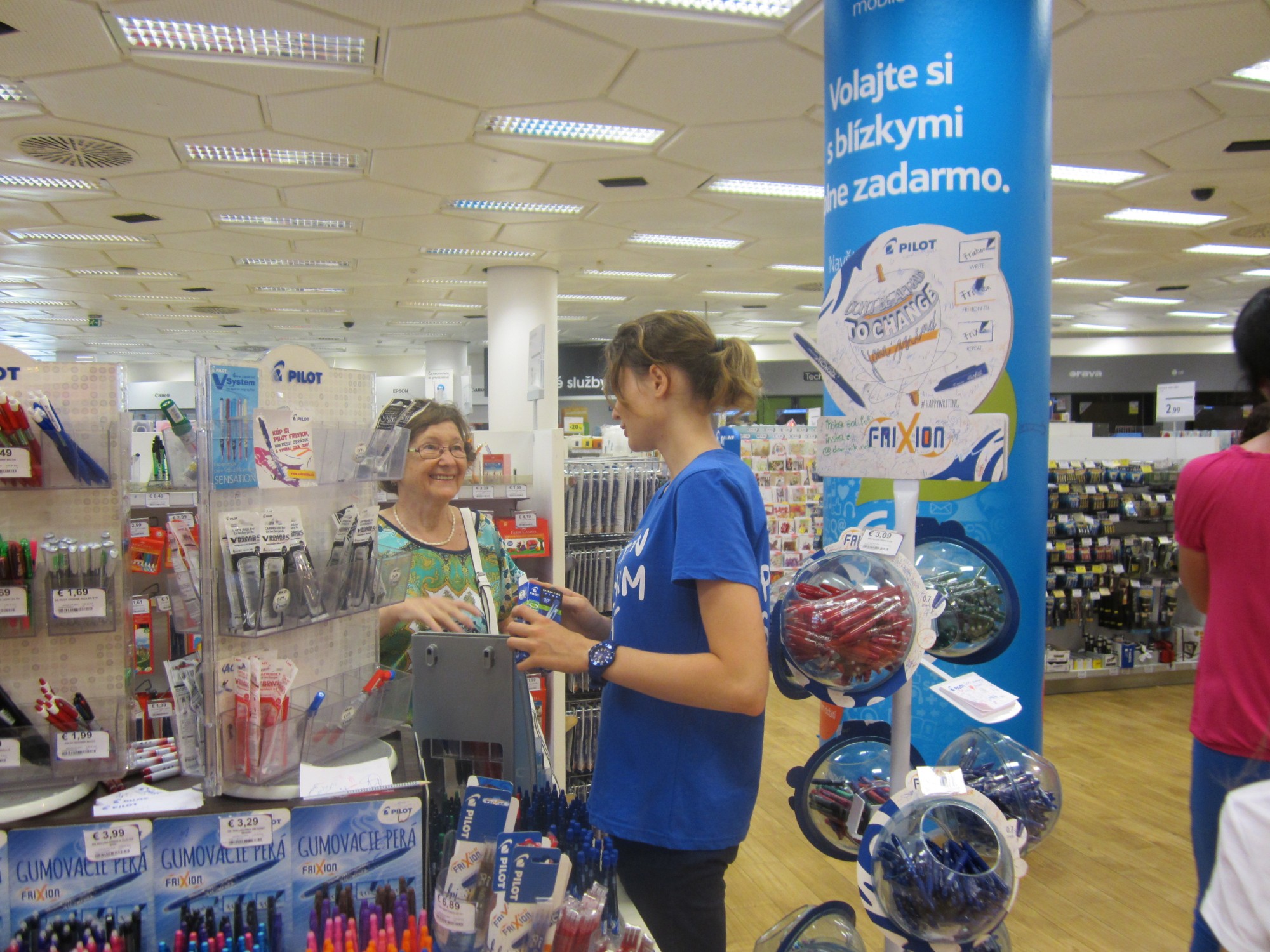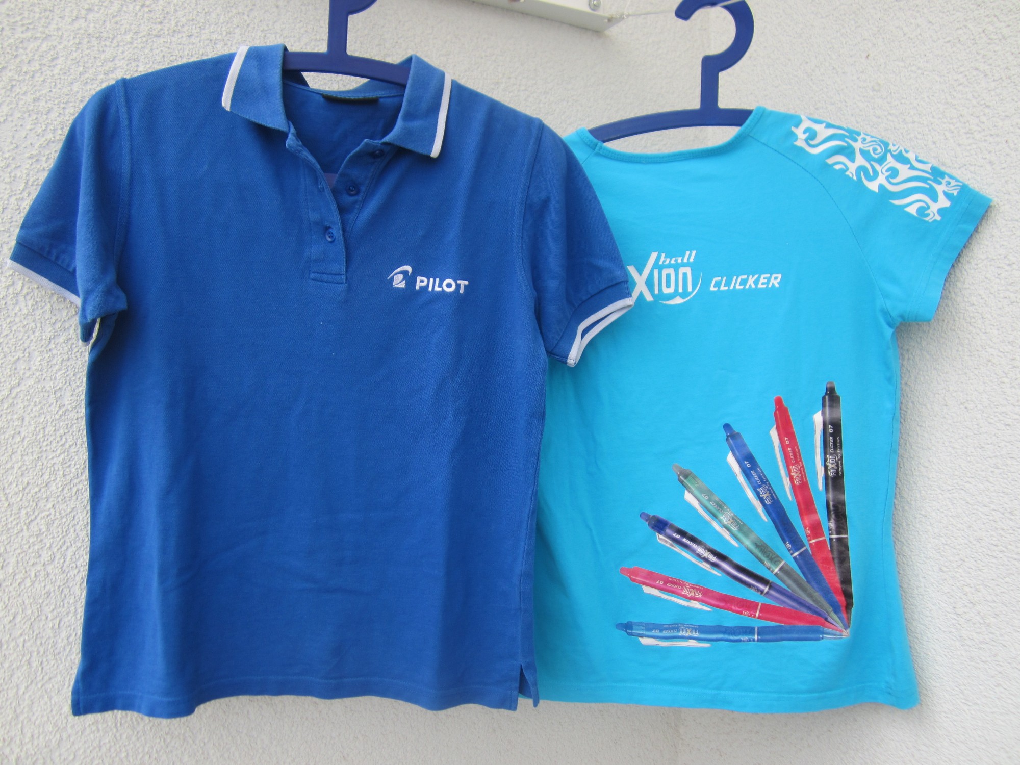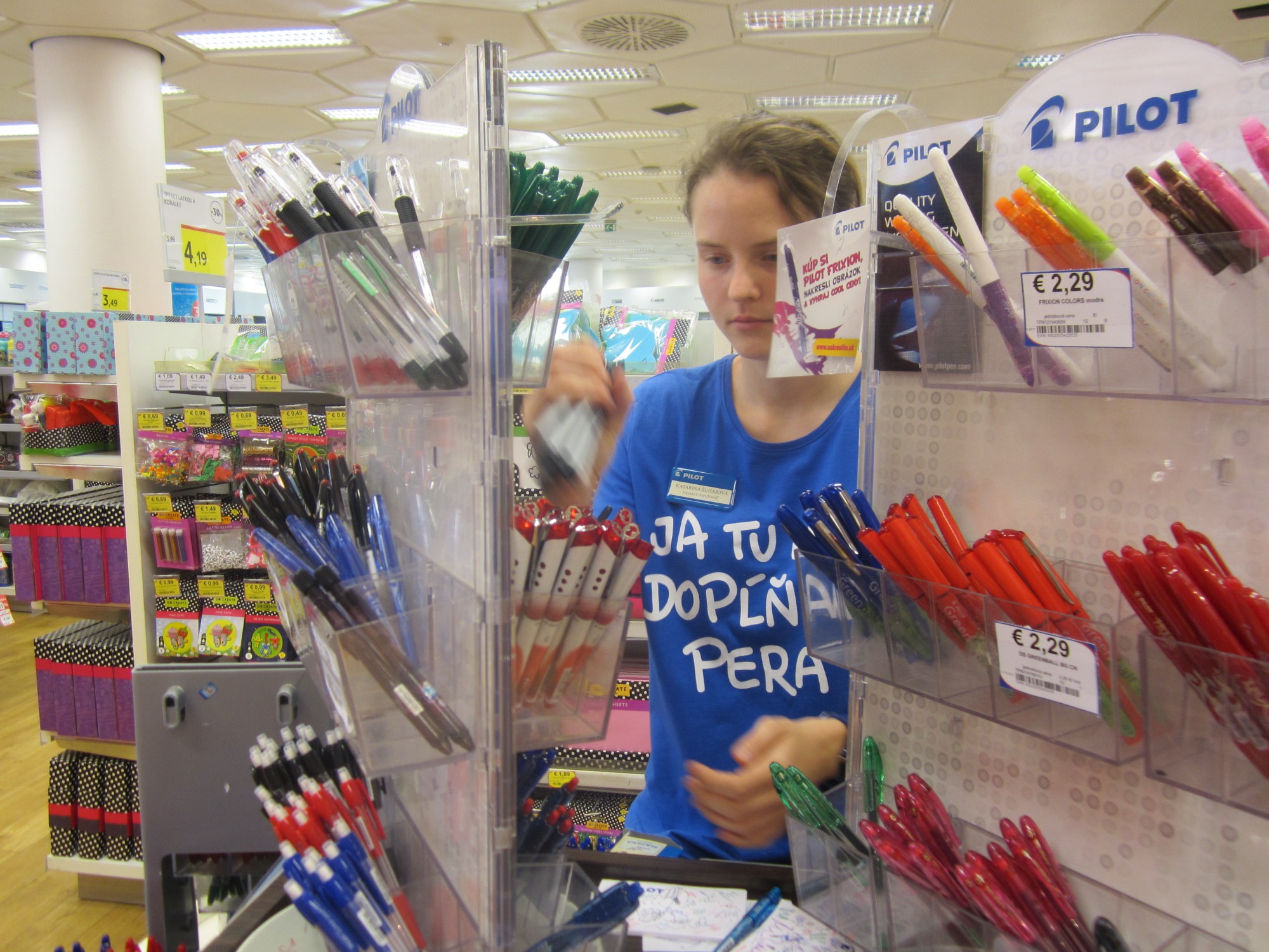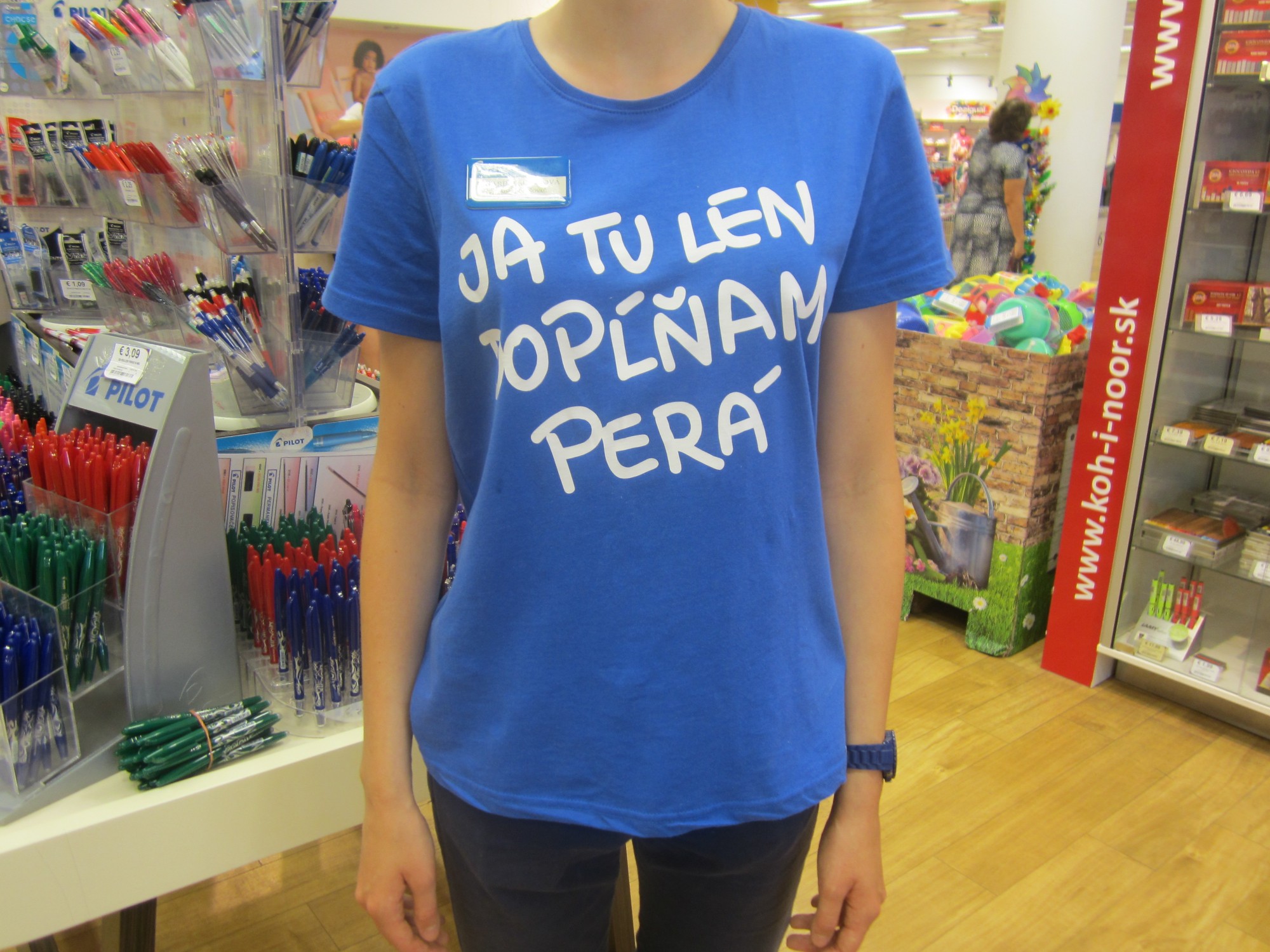 Therefore, I decided to work with my outfit. I designed myself a new working T-shirt with a sign on both sides. To choose the right words was the most problematic part for me, because it had to be short and as clear as possible, but I didn't want to offend anyone at the same time. I wrote "I am just filling in pens here" at the front and "I'd be happy to help with Pilot pens" at the back of the T-shirt. I am also aware that there will still be cases when I can't avoid a questions, but my goal is at least to minimize it.