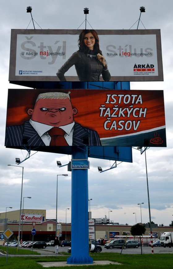 For me, his 2010 project became the most critical one. It reflected Slovak society’s dissatisfaction with the most recent elections. It was an anti-political campaign for those parliamentary elections. Shooty pointed out to the behaviour of politicians who lie and steal money using illustrations on advertising spaces in public areas. People could support this project financially, therefore becoming part of Shooty’s work and idea.