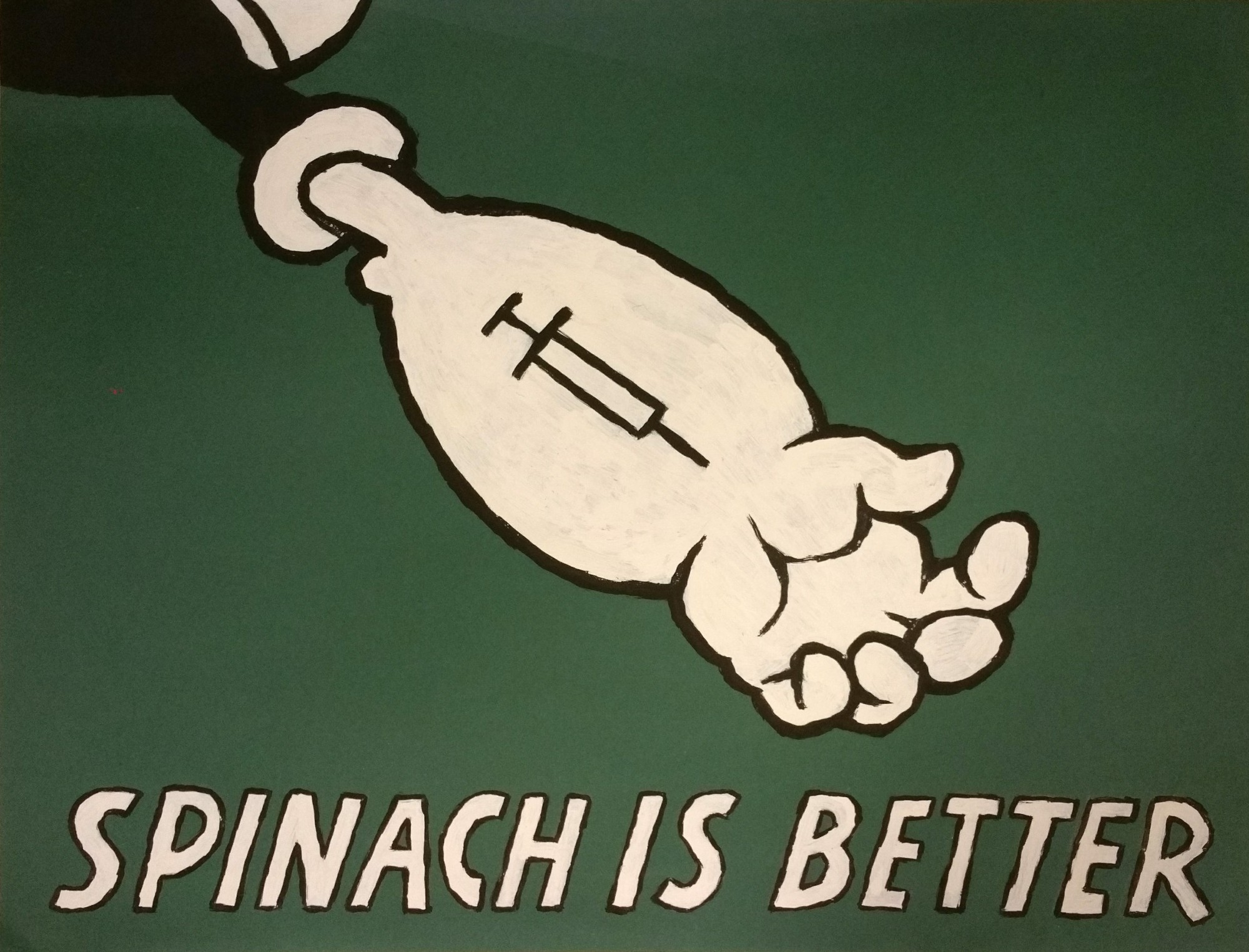 "Spinach is better" is an easy one. Obviously Balogh is putting anti drugs ideas mixing Popeye's hand (who was famous spinach lover) & syringe - typical drugs addiction symbol.