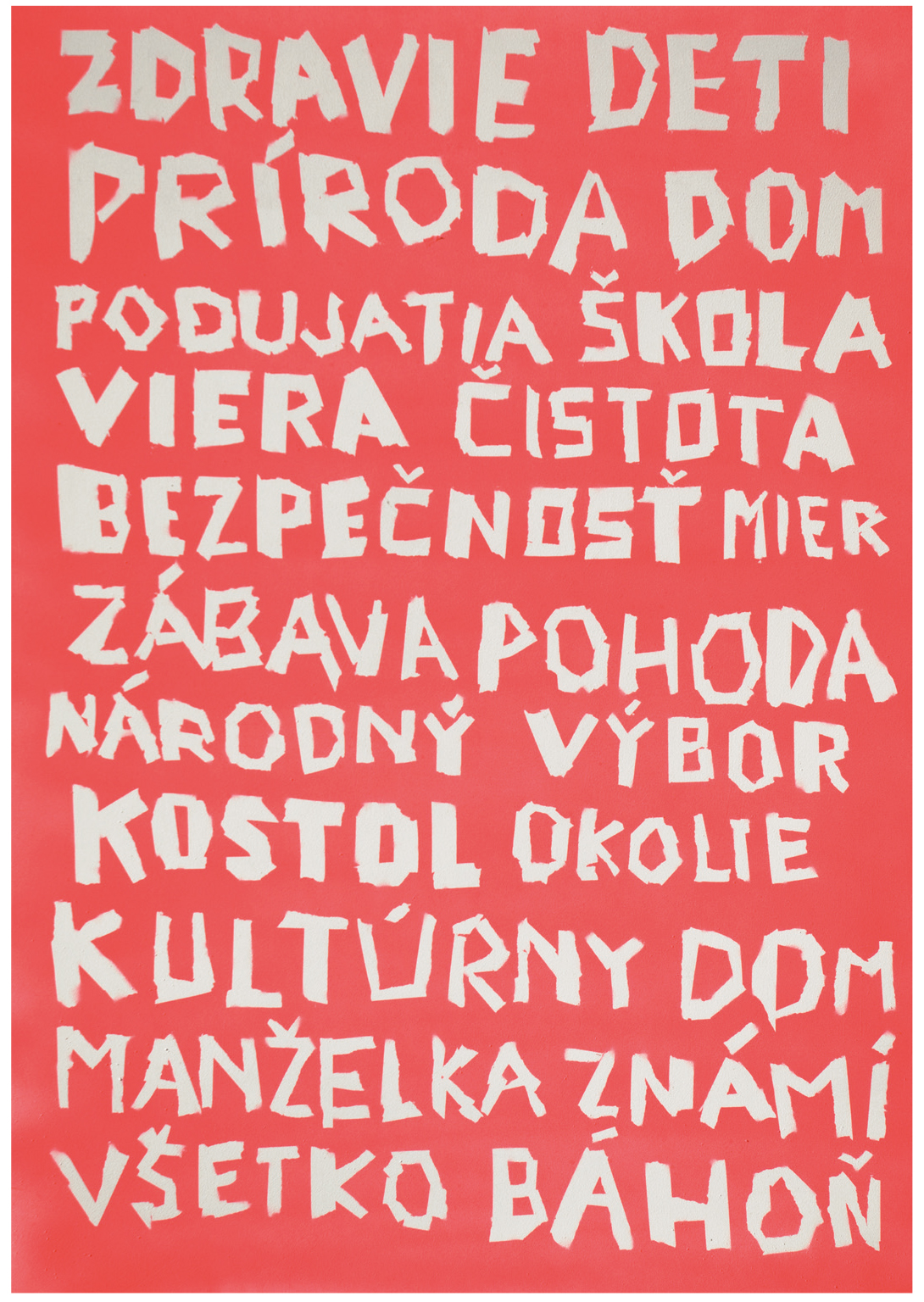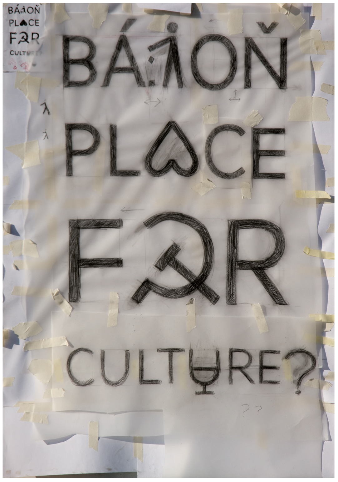 Themes concerned the surrounding of Bahoni pri Trnava and the problems that oppressed the inhabitants of the village. The research made in village called Báhoň, showed that there is a serious lack of meeting places and the absence of a cultural house. They aimed to ask the public: What is the most important thing for you in Báhoň? They decided to make symbols of these words and combine them with typography. Some words and letters were changed into symbols. For example the letter „T” in word „kostol” changed into cross etc.