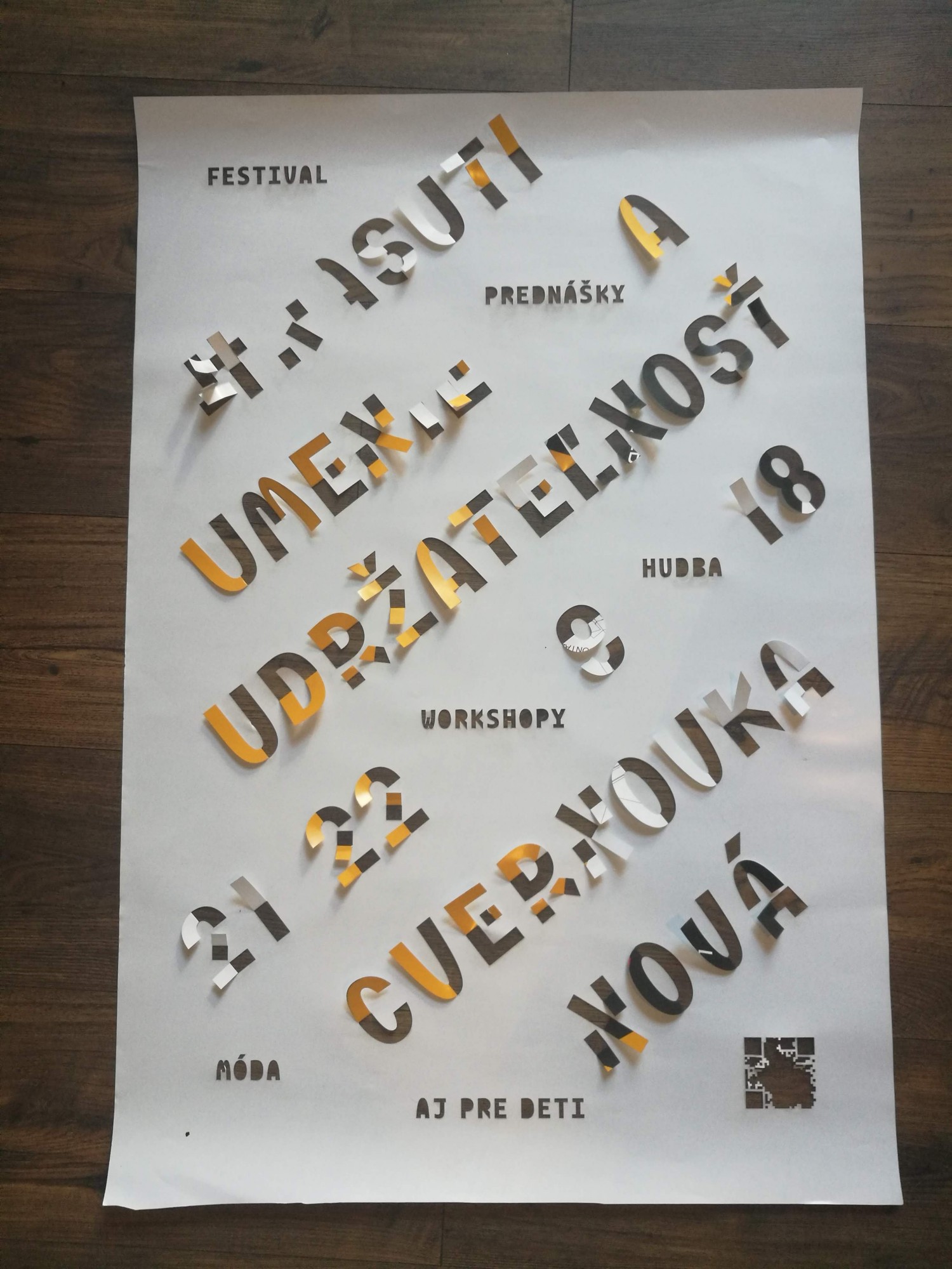 from recycled waste - old posters from various members of Nova Cvernovka. A typographical concept by Matúš Lelovský was used to cut the letters out of the back of the old posters. The letters needed to be manually folded and each poster created a unique colour combination.