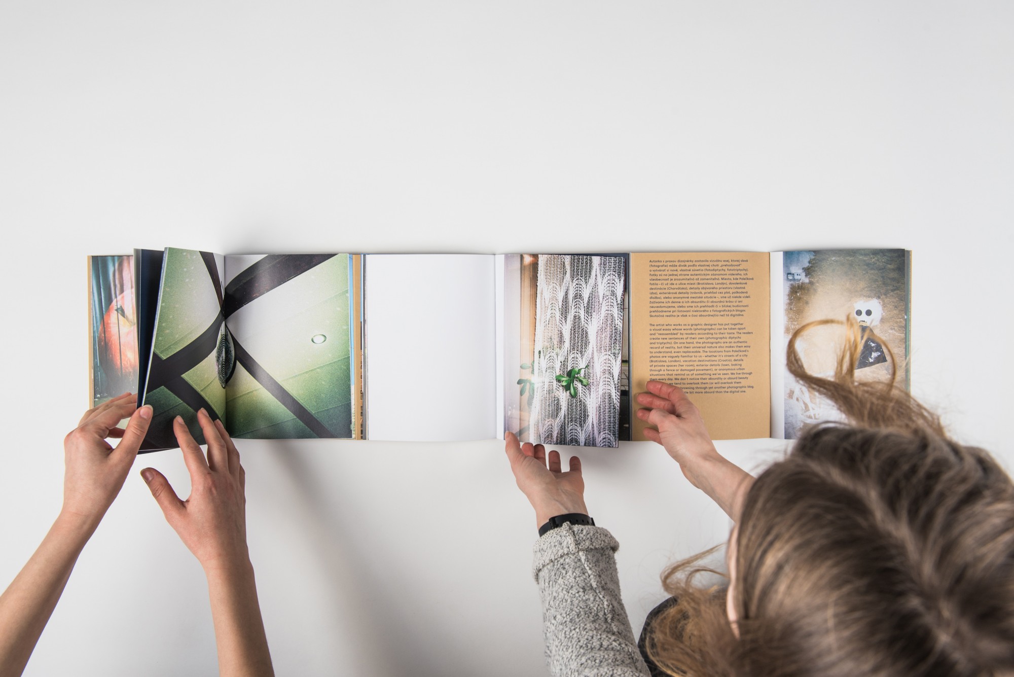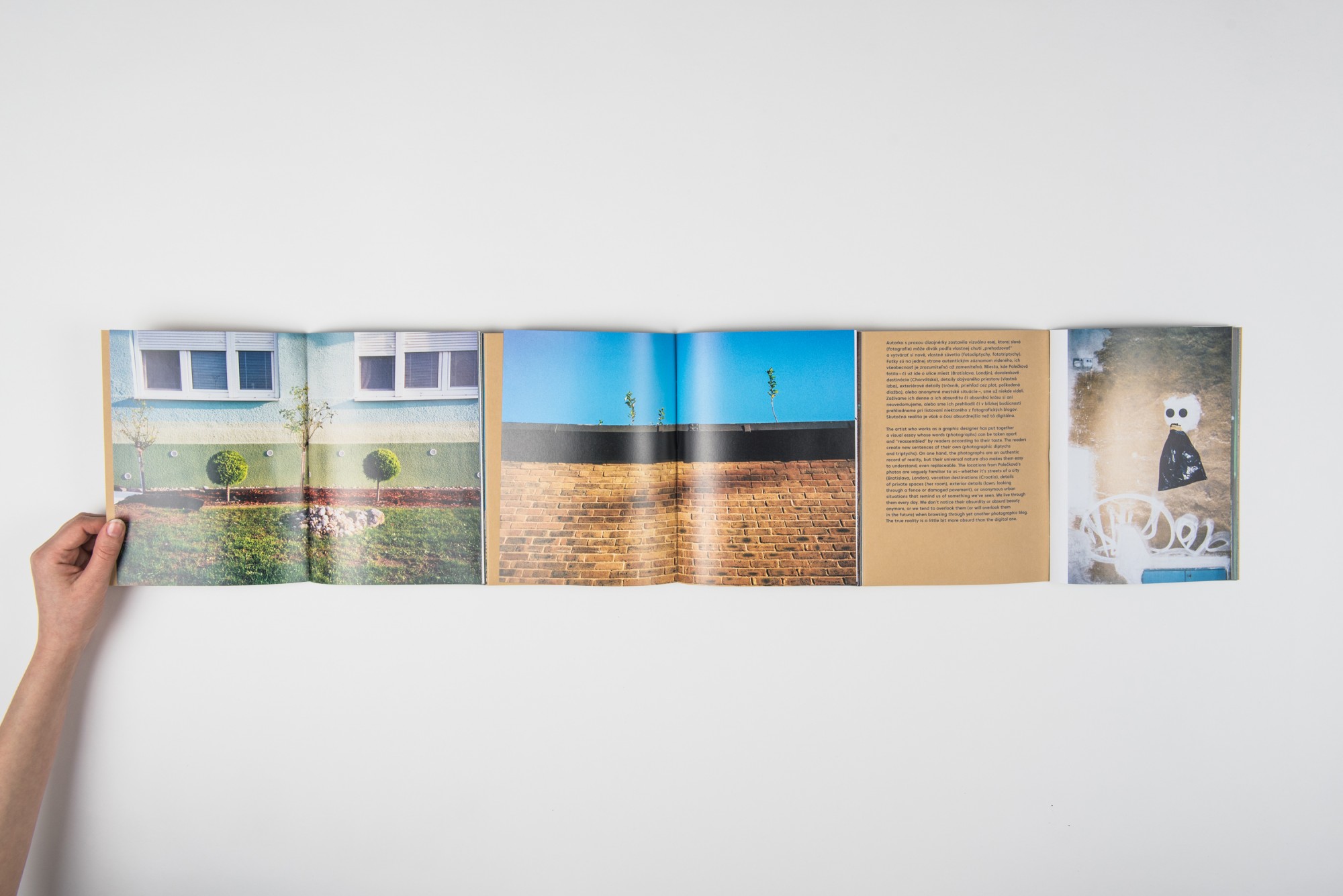 Three blocks of the publication are connected within one shared binding. The reader can browse all three parts at once or create their own diptychs and even triptychs. They become an active co-author of the publication. The meaning of individual images changes when viewed in concert with other pictures. The reader creates a variety of stories, much like a Choose Your Own Adventure novel. Browsing through the book becomes a contextual game. The reading of photographic materials is subjective because everyone's perception is based on his or her own capabilities and experiences. For this reason, this freedom is both beneficial and innovative for the reader. The format of the book also refers to randomness and absurdity of the images inside.