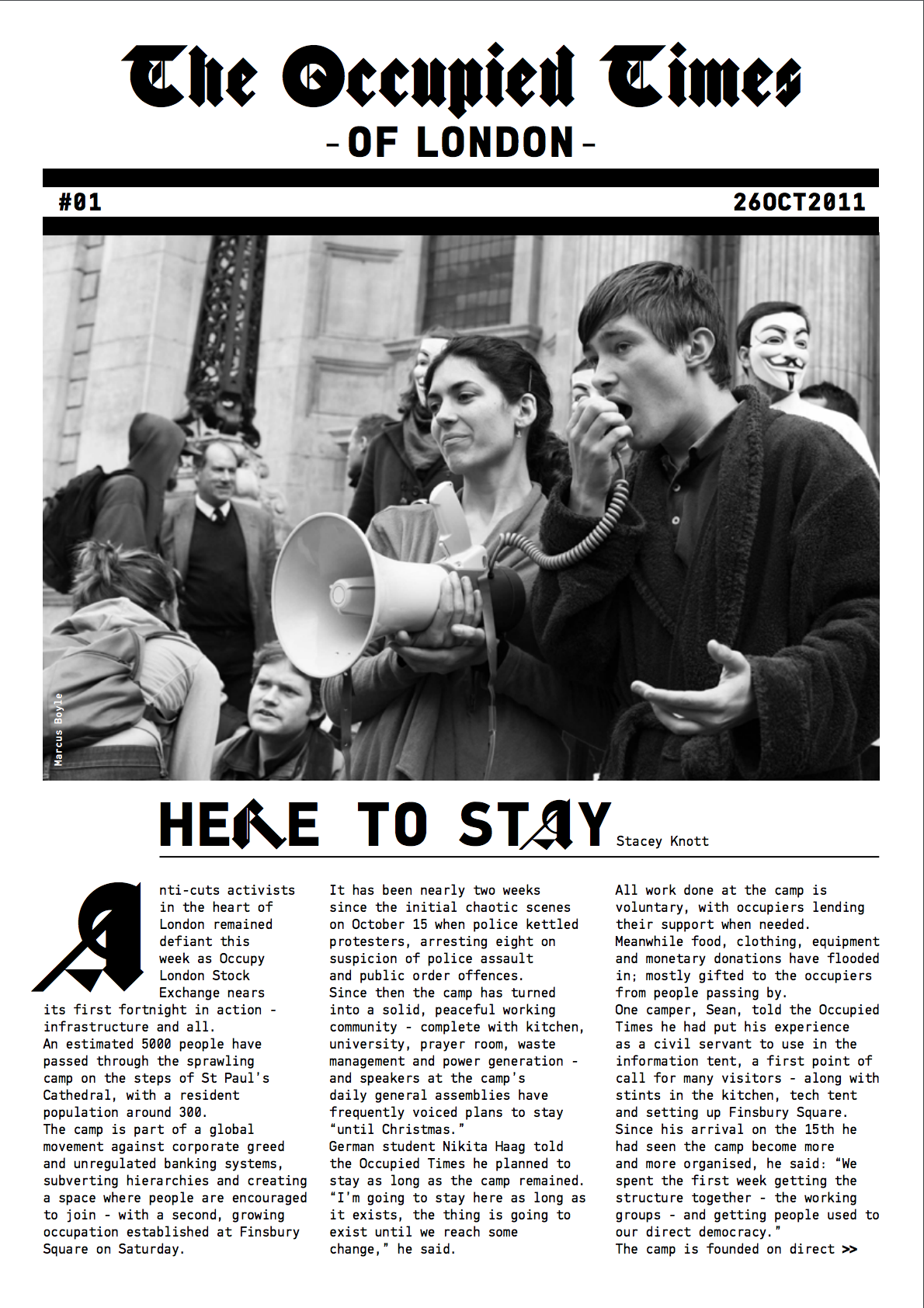 The paper was founded during the first week of the Occupy protests in London, in October 2011. It was founded by graphic designer Tzortzis Rallis. Just nine days after the occupation began, on 24th October, the first issue was published. The first issue was consisted of 2000 copies of 12 A4-size pages. After that, a dedicated team in the tent in front of the London’s St. Paul Cathedral published an issue every week. For the next 6 weeks, the paper was published in A4 size, but over the time it gradually grew to A3, and later to proper sized publication. Currently, the paper exists as an online archive. Until it ceased publication 2017, it was printed every quarter or so.