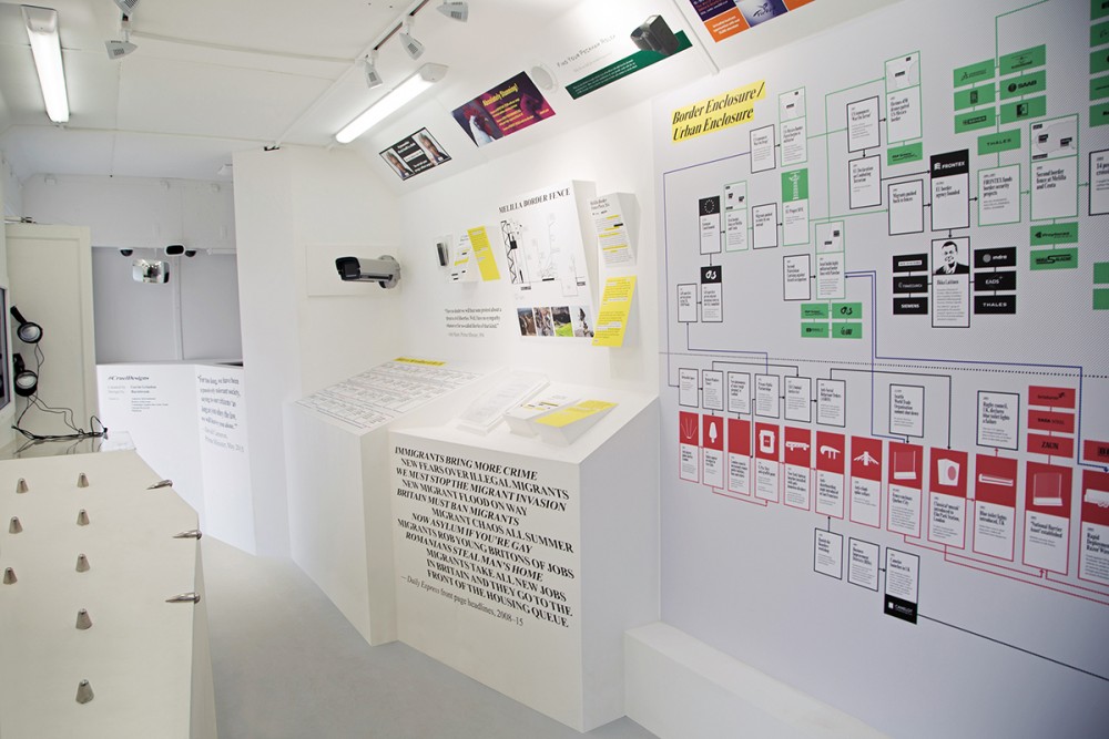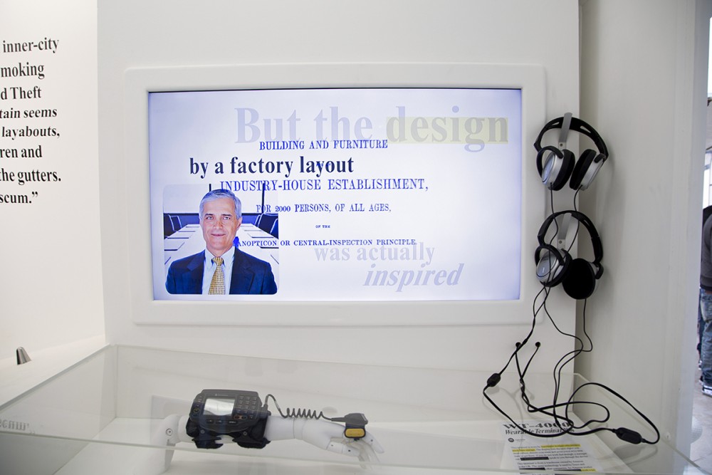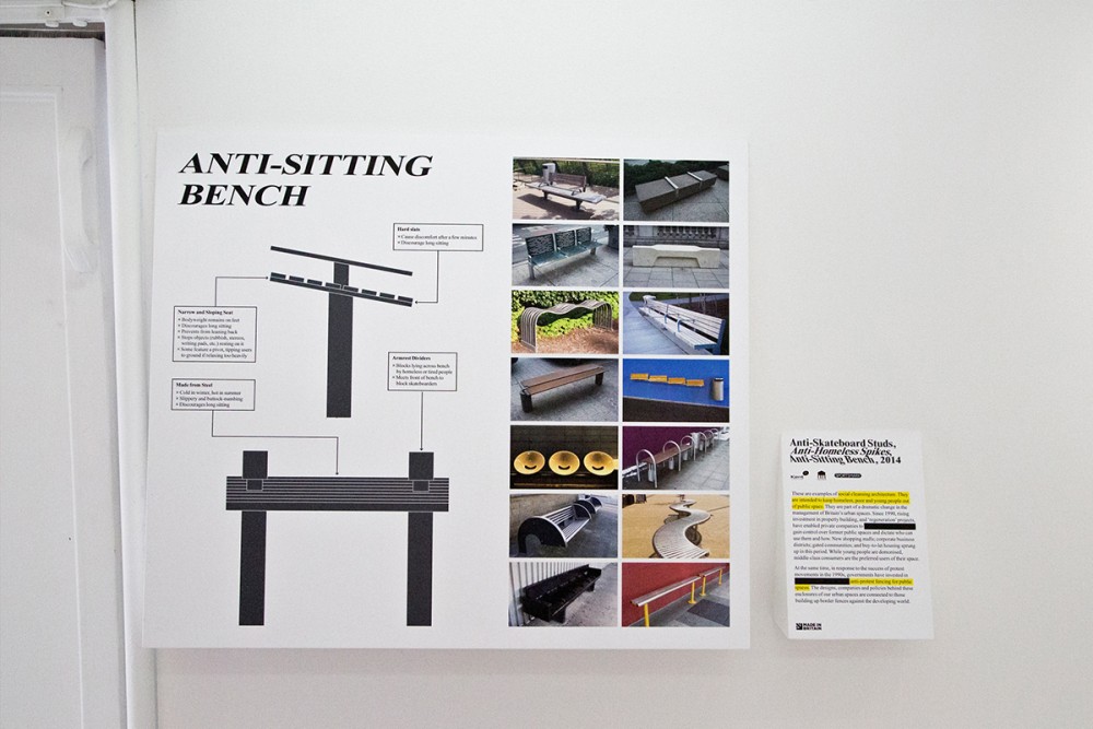 After walking into the caravan, we were greeted with white space with messages on the walls. Inside, we found items designed to hurt us or others. That was one of the first messages we saw when walking into the space. The objects there include less-lethal weapons, anti-sit benches, and humane slaughter methods. One video was called Wearable Terminal. In this video we saw employees using items such as: anti-skateboarding studs, anti-sitting benches, and anti-homeless spikes; all examples of social cleansing architecture.